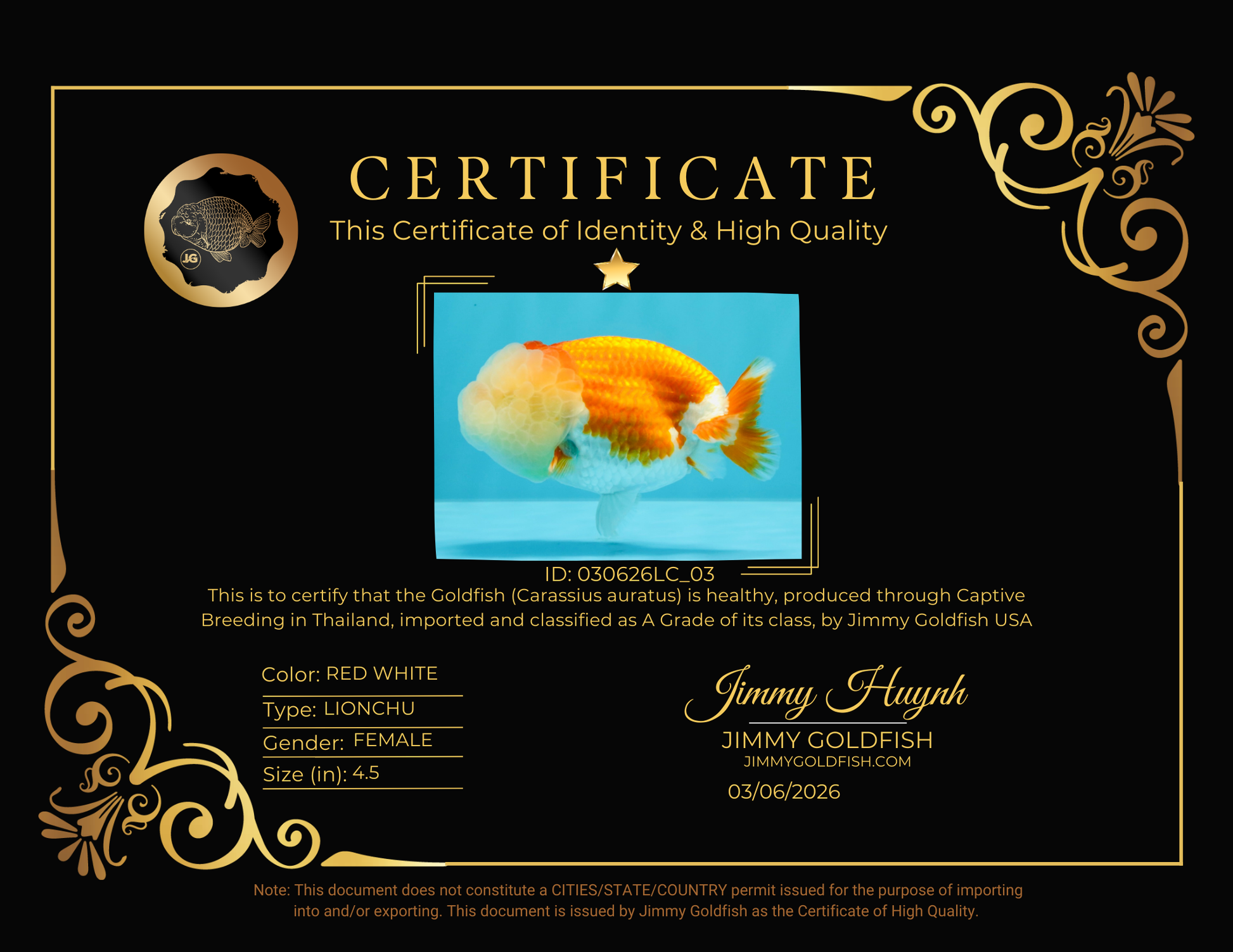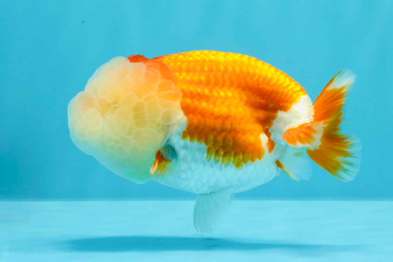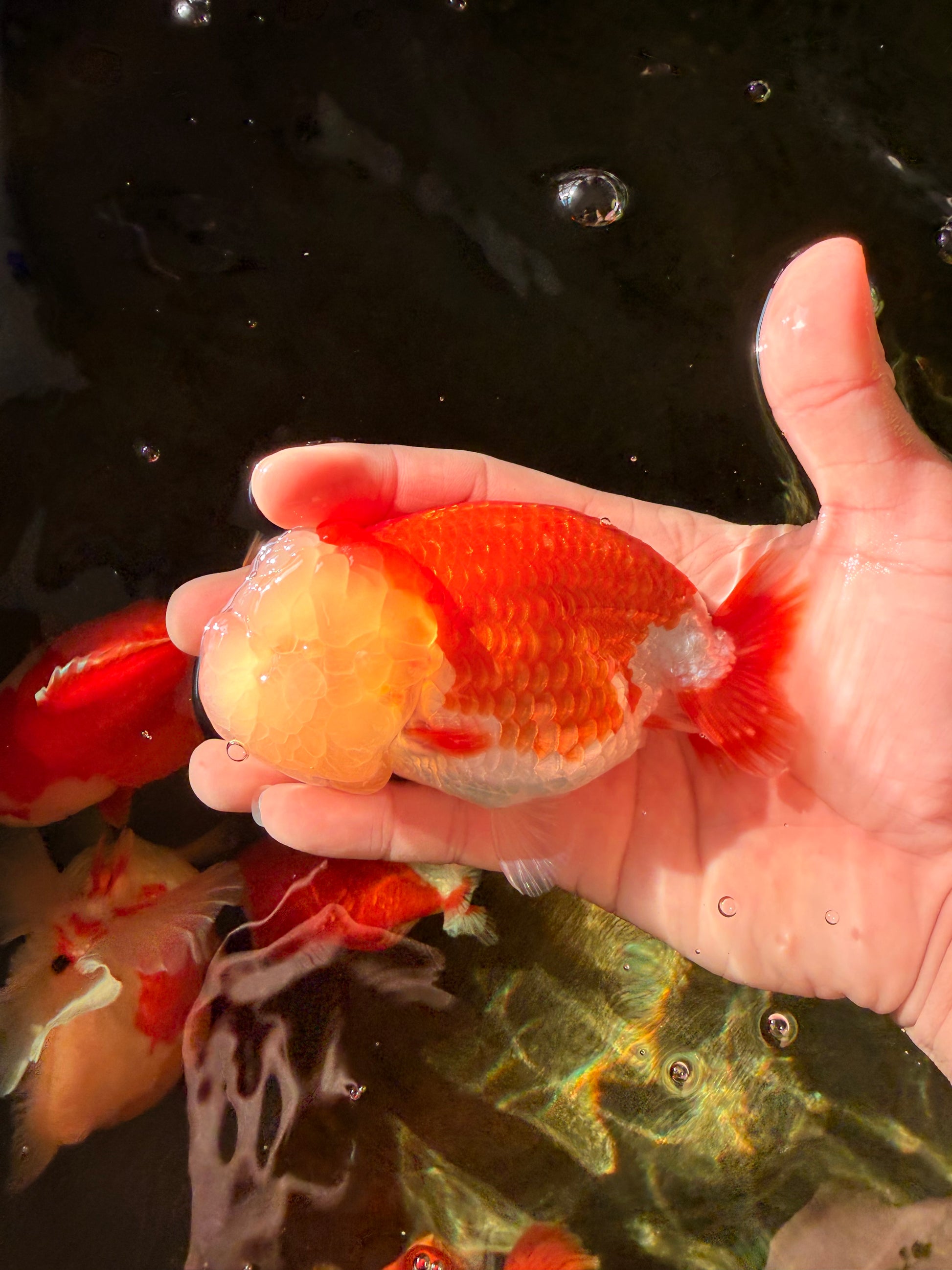 Classic red-white pattern with rounded LionQueen body. Clean lines and balanced swim make her easy to appreciate. A cheerful addition to any fancy tank.