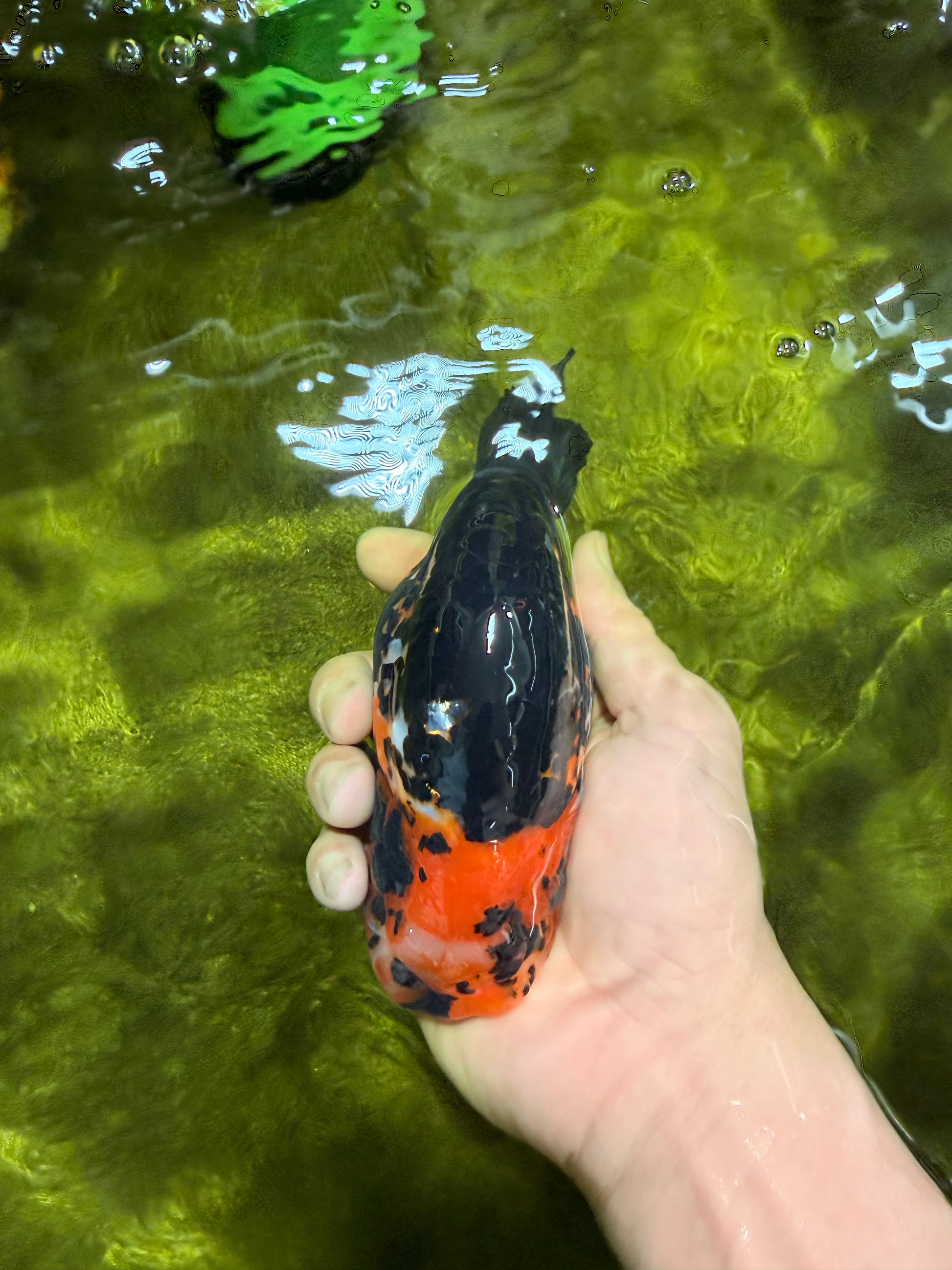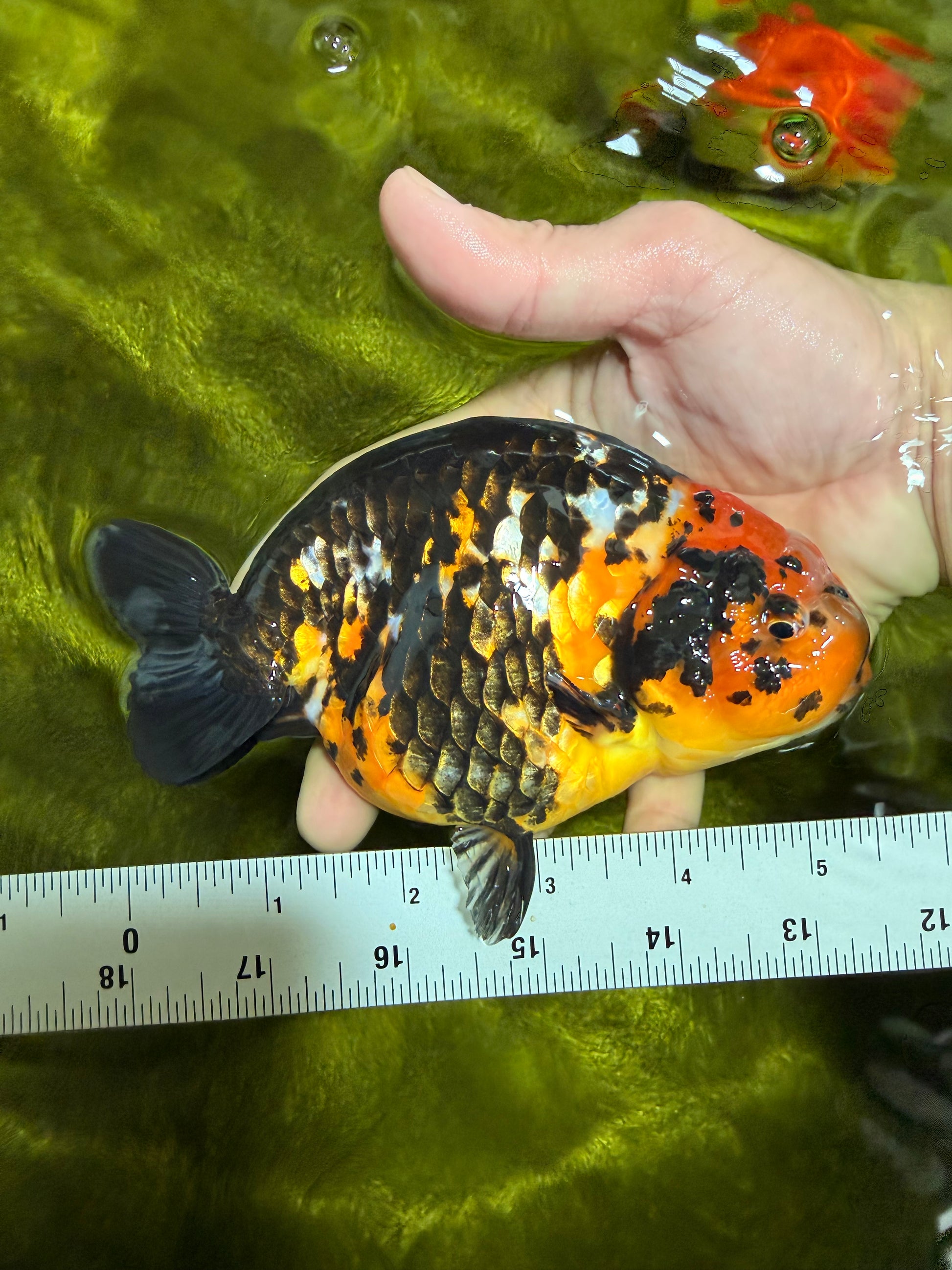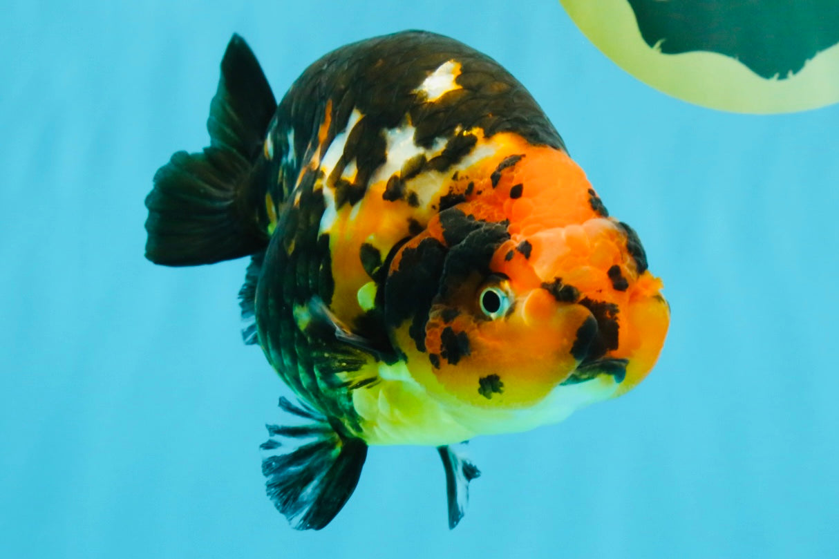 Bold tiger markings over a smooth Ranchu back curve. Balanced 5.5” body and calm temperament. Strong visual appeal with steady, graceful swim.