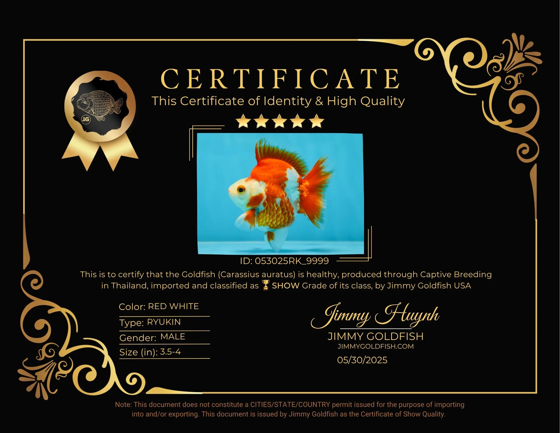 3rd Runner Up SHOW GRADE Red White Ryukin Male 3.5-4 inches #053025RK_9999