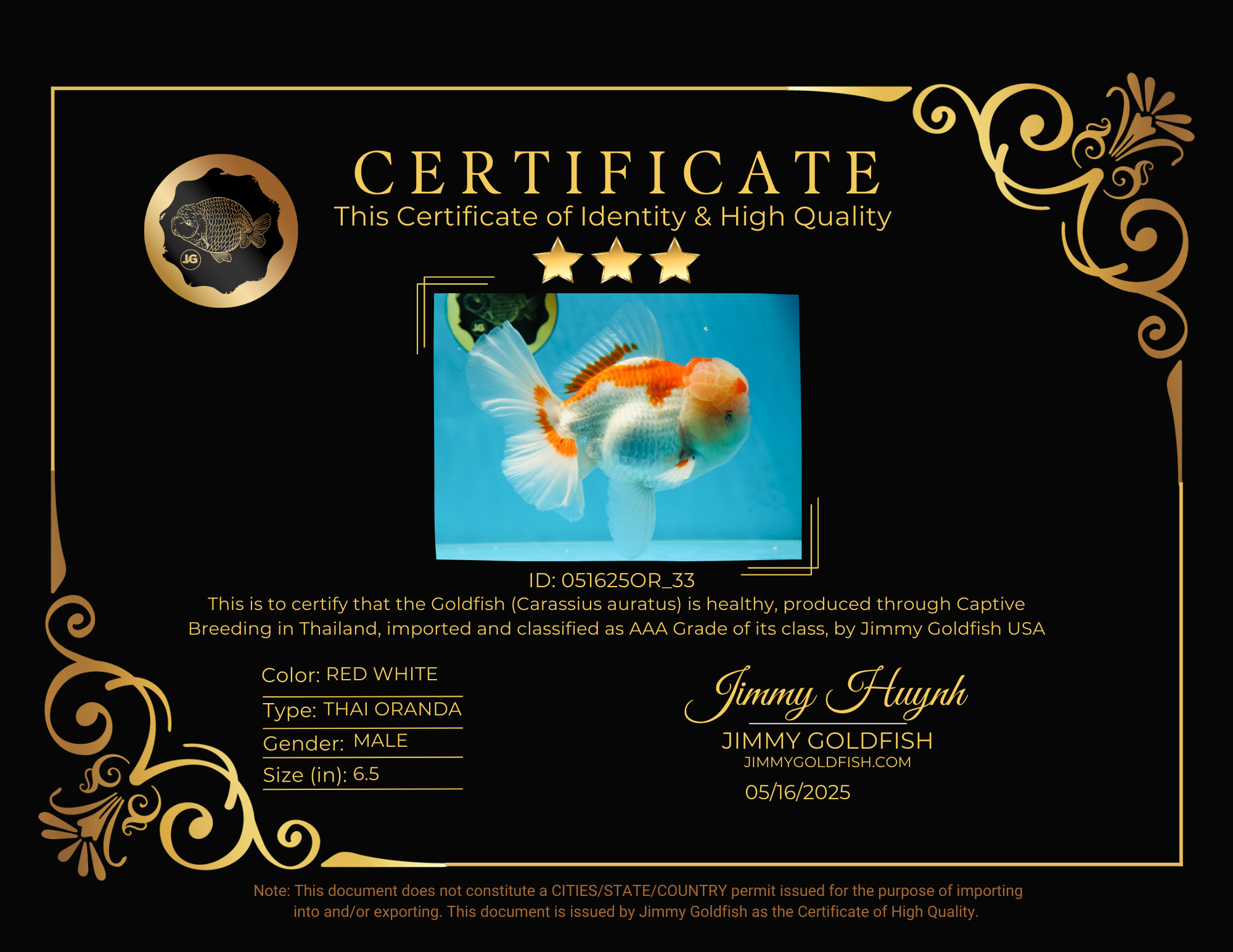 AAA JUMBO Grade Red White Oranda Male 6.5 inches #051625OR_33