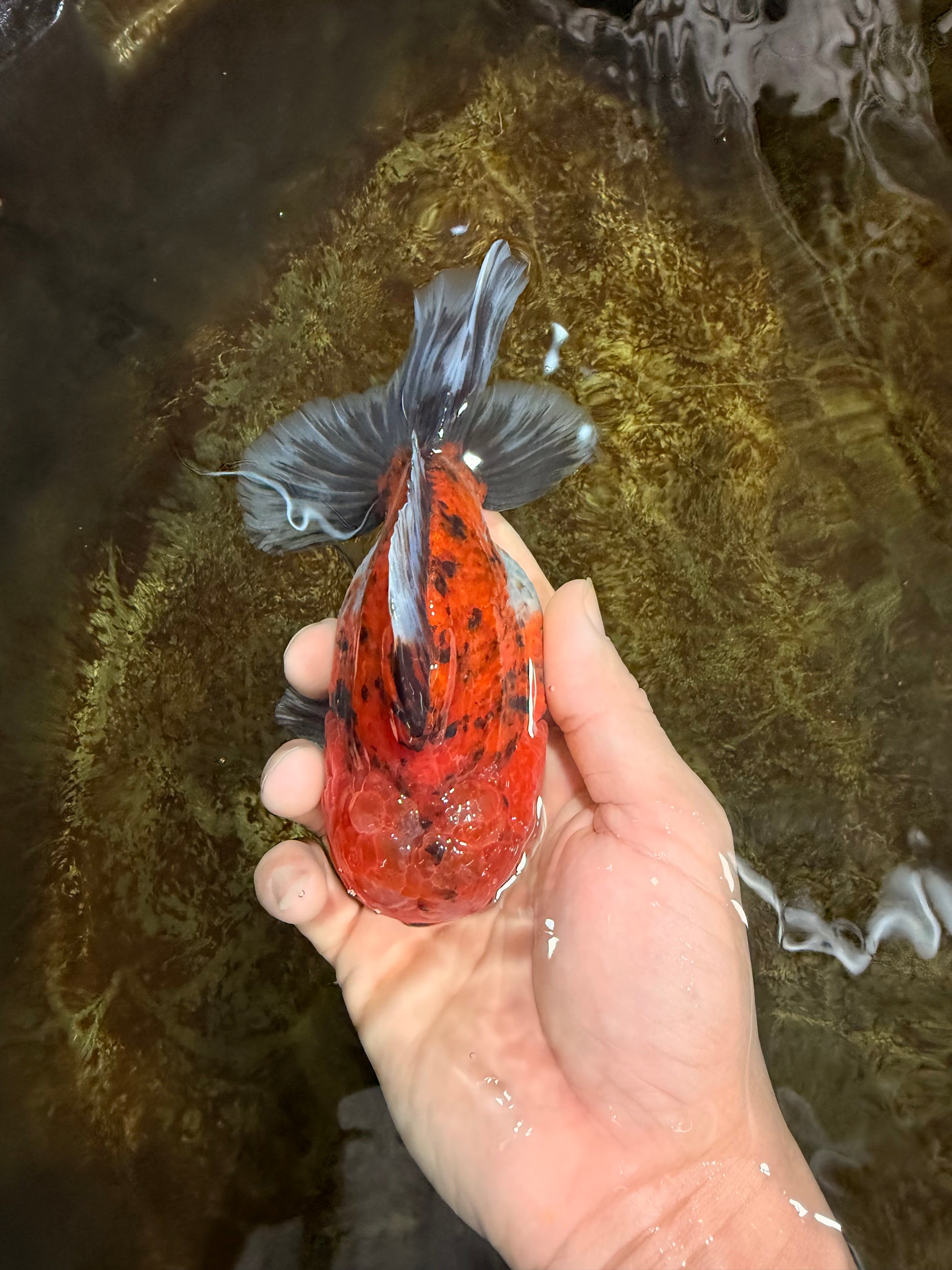 This Calico Oranda brings art to life with a bold mix of orange, blue, and white. Smooth head growth and graceful swim — a joyful star in any tank.