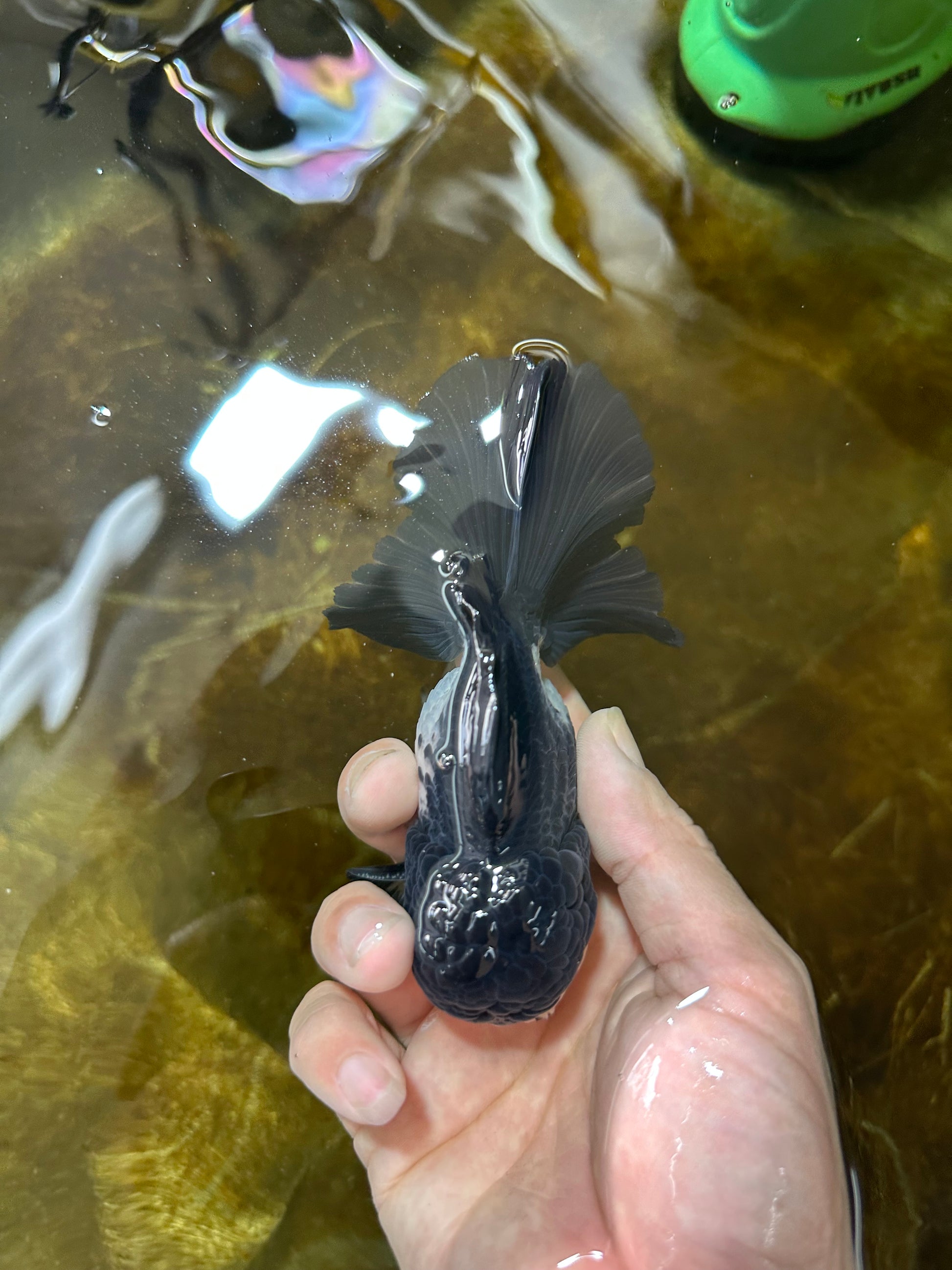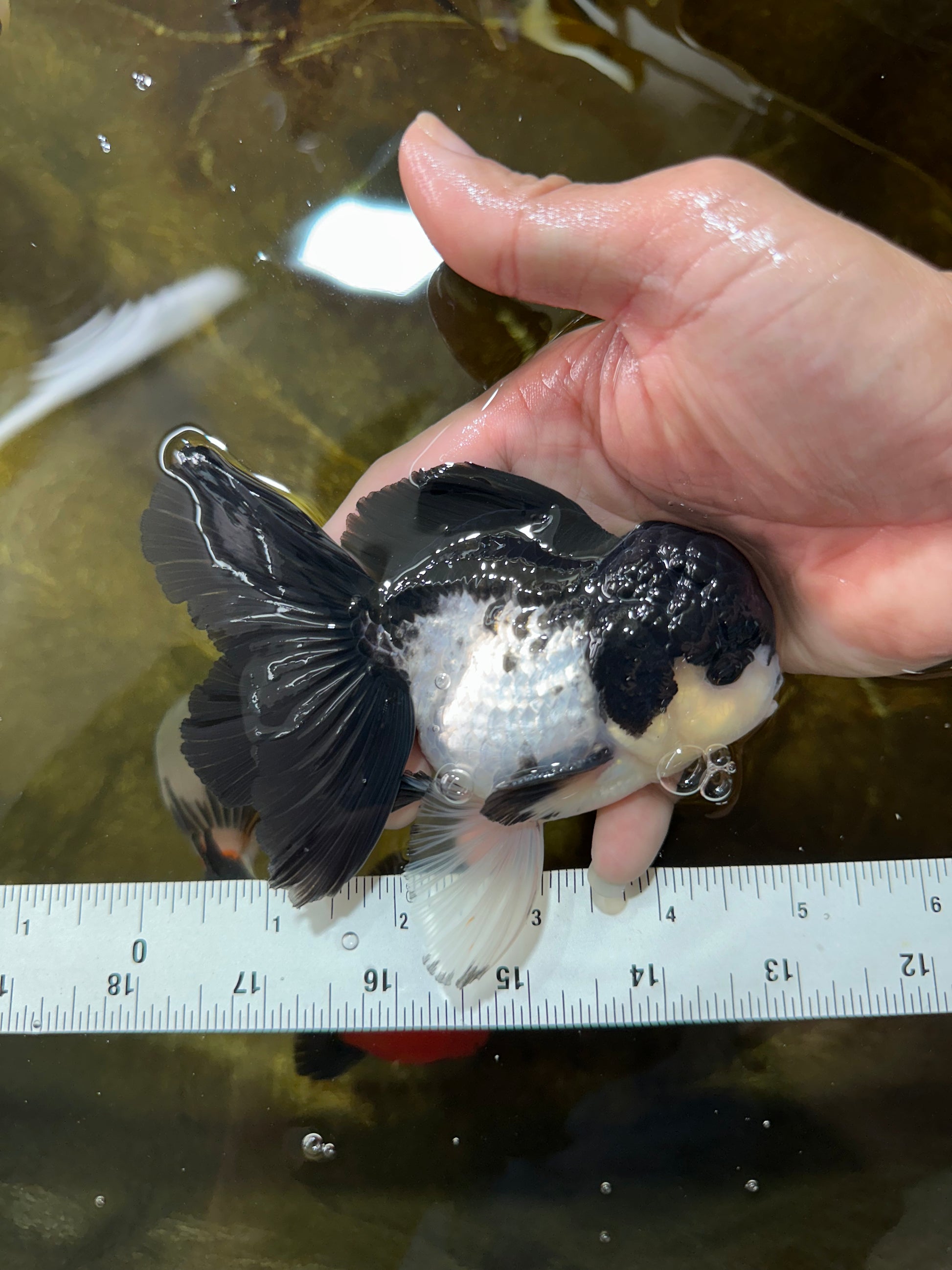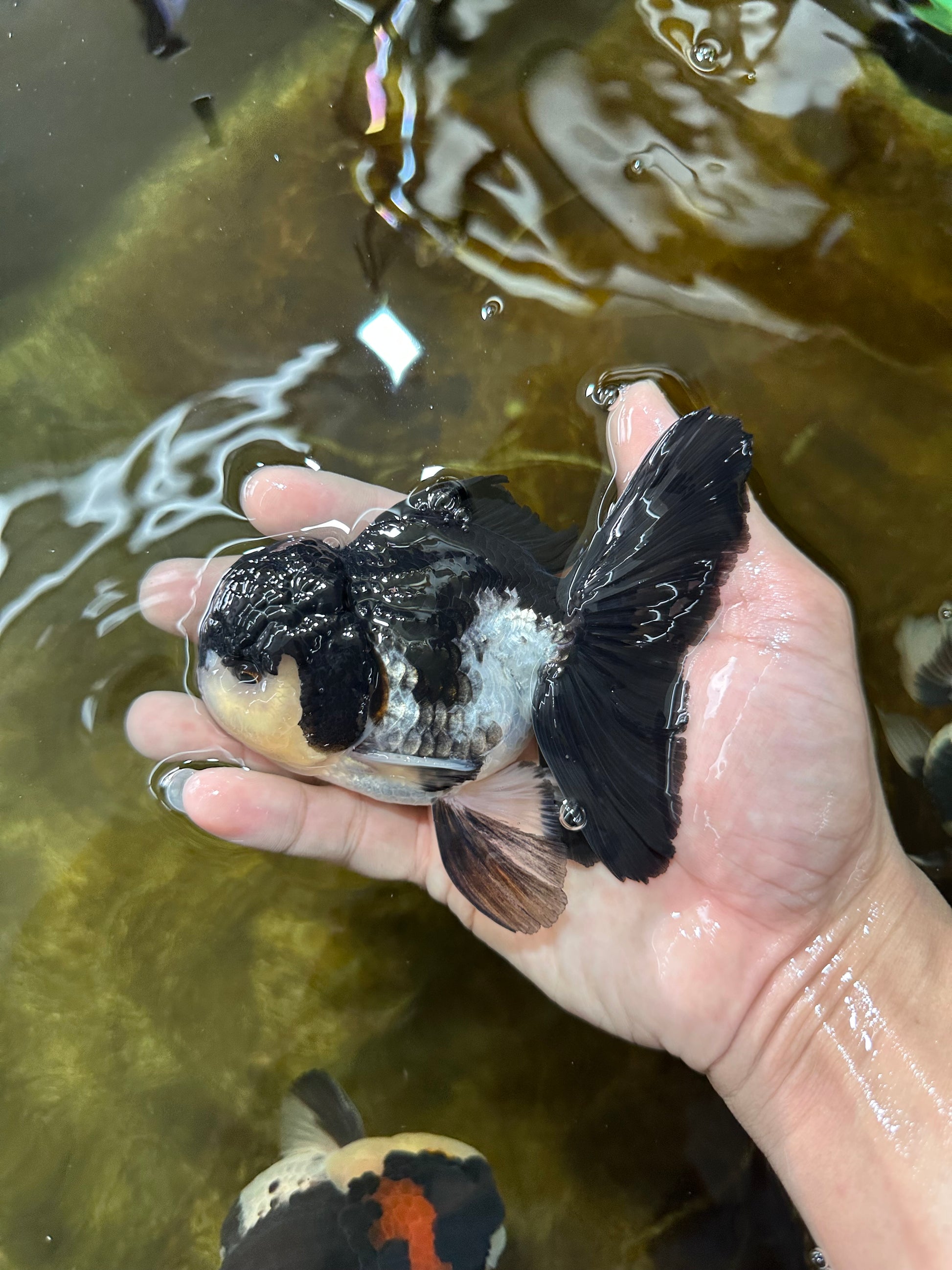 With its cute panda face and curious button eyes, this Oranda is pure joy to watch. Playful yet gentle, it’s the perfect buddy for community tanks.