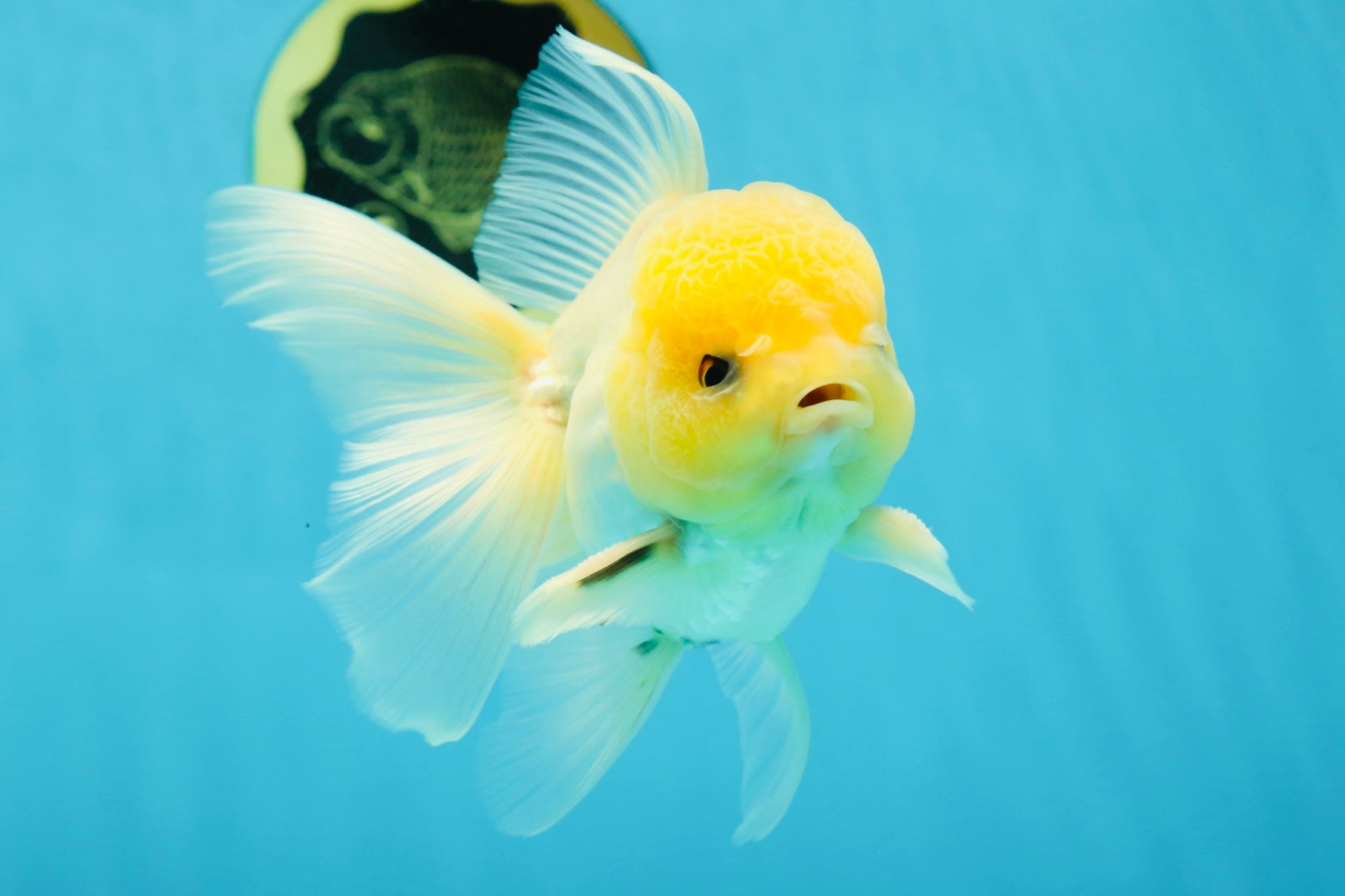 This milky-white Oranda with adorable button eyes feels like a floating snowflake. Peaceful, premium, and full of charm. A total zen master in fish form.