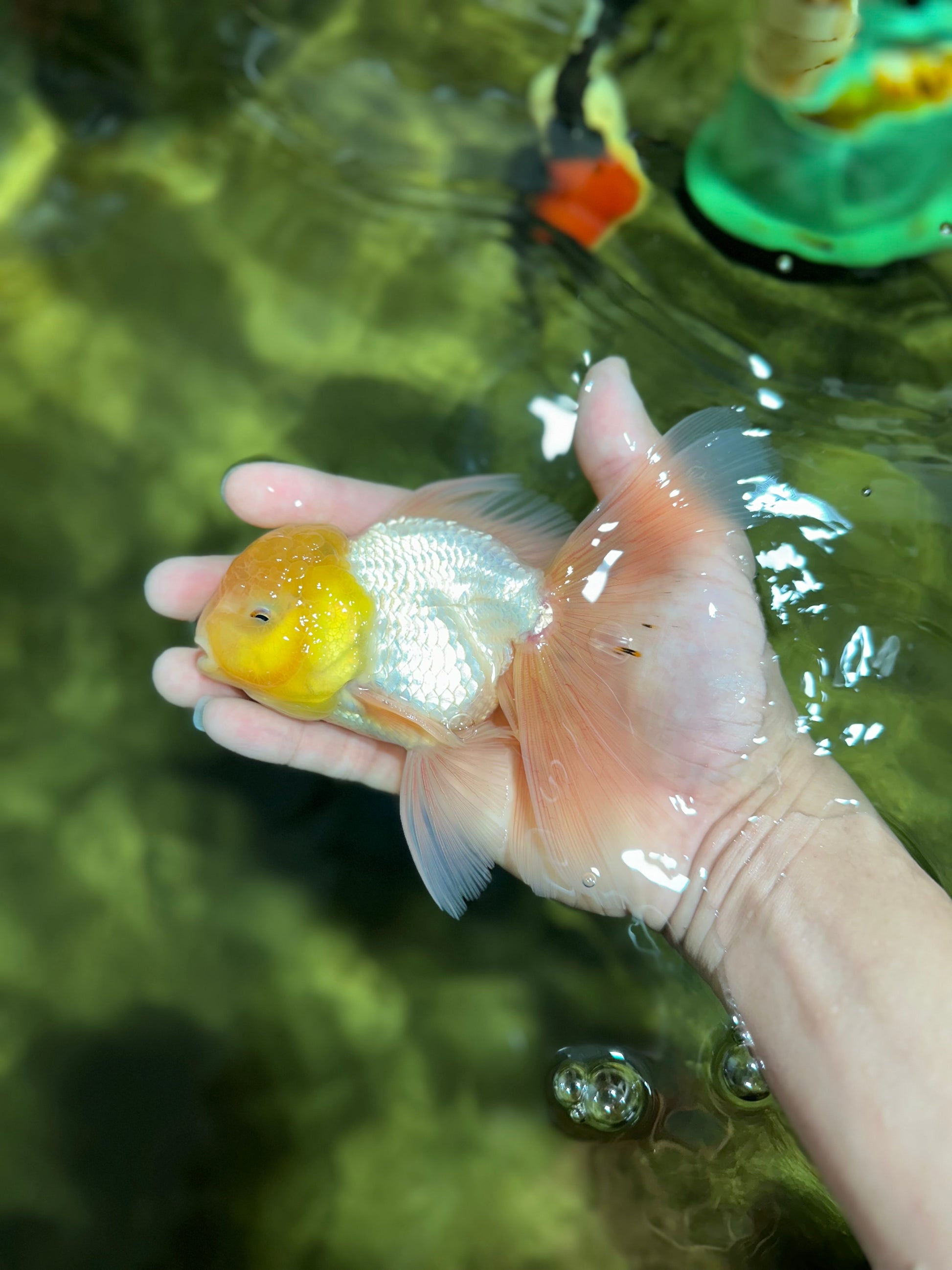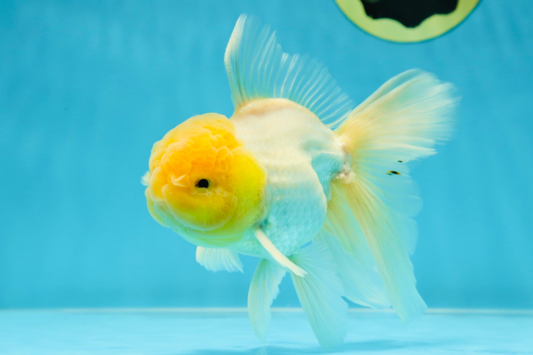 Big, fluffy, and all white — this Oranda glides like royalty. With premium growth and serene movement, he’s a dream for lovers of clean aesthetics.