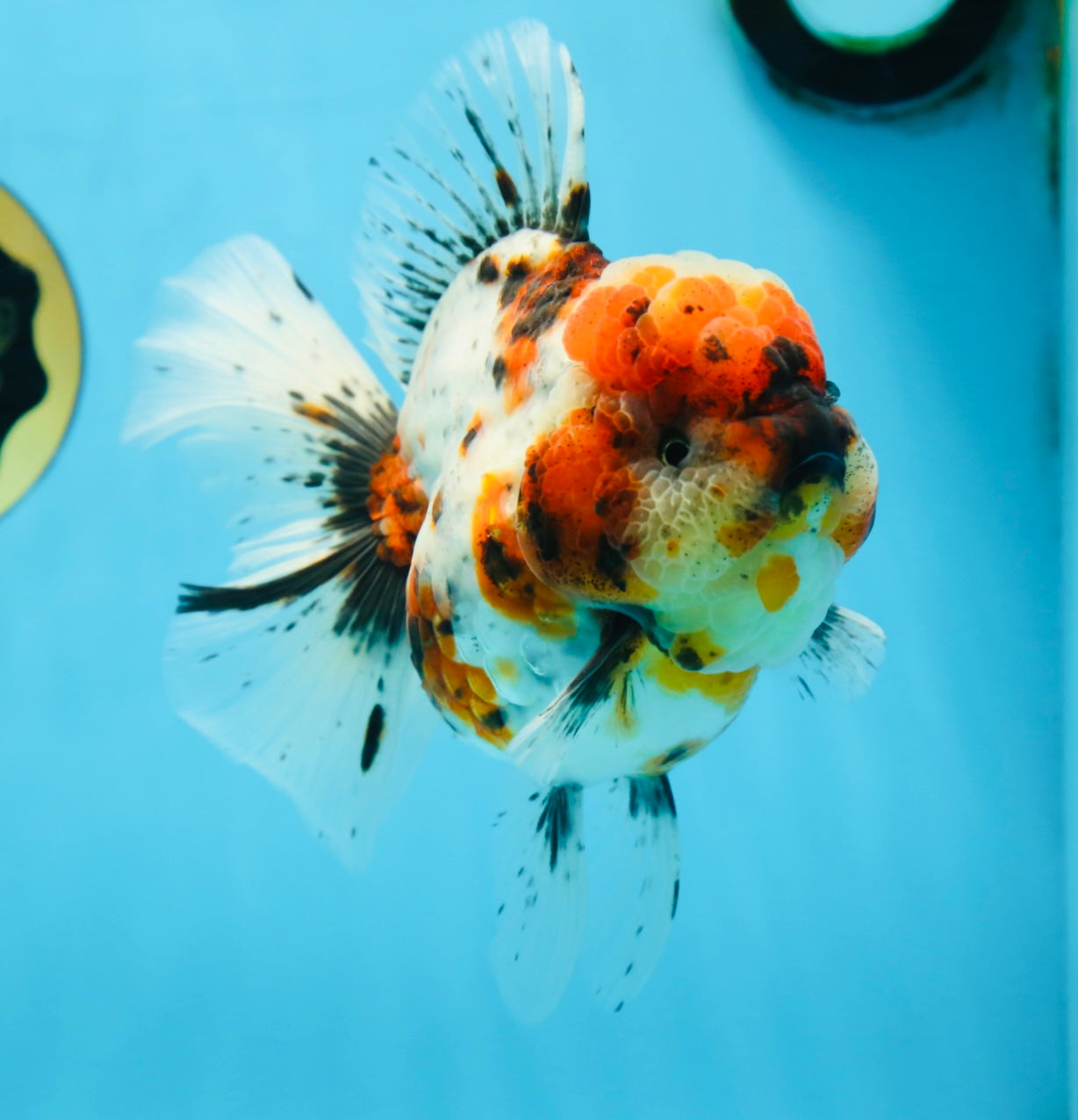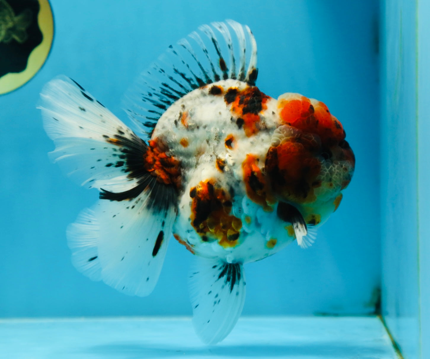 Godzilla head growth plus calico patterns—an unbeatable combination for goldfish connoisseurs.
