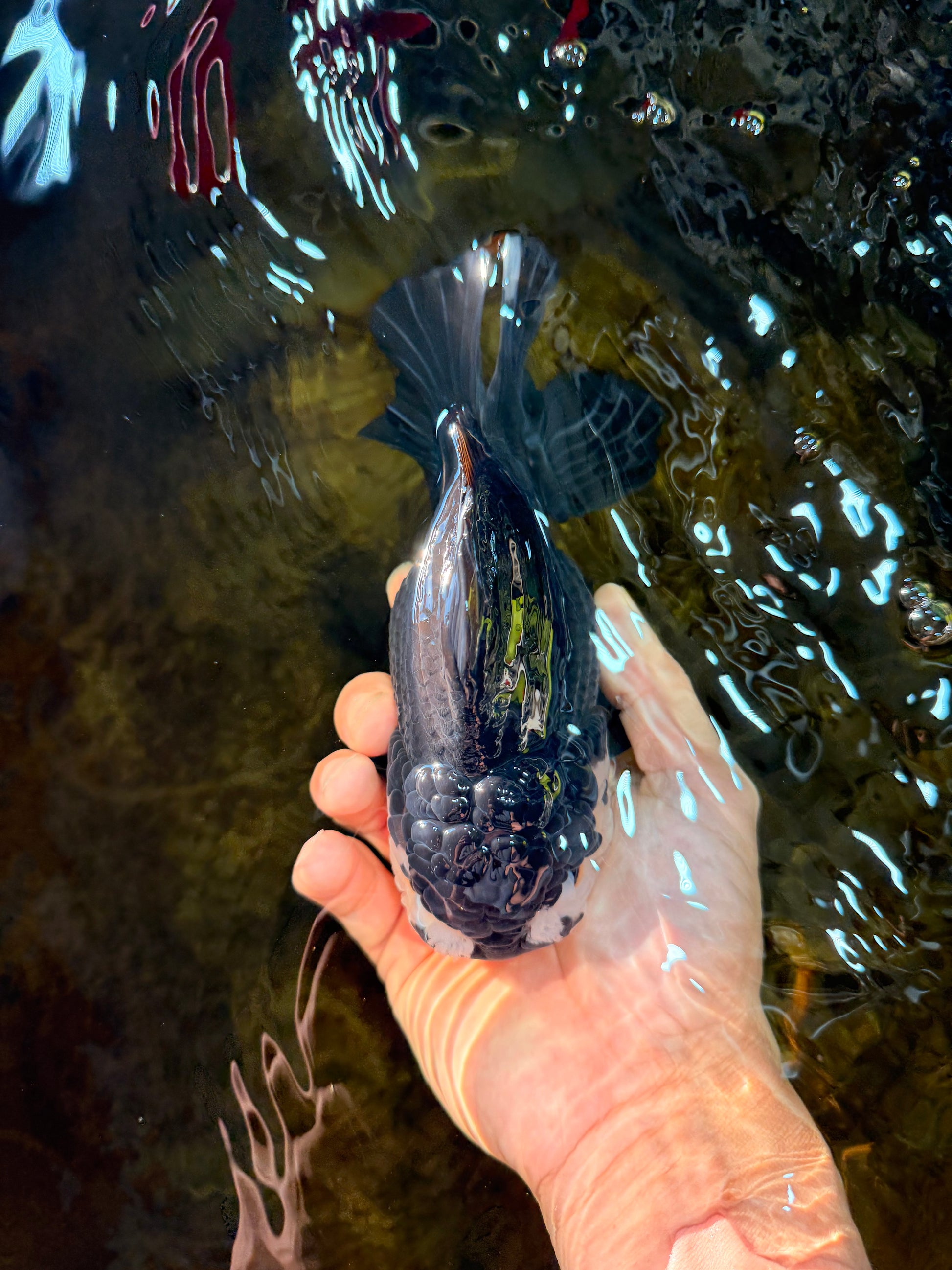 Adorable pompom nostrils and bold panda contrast — she’s six inches of bubbly personality and premium symmetry. Perfect for fish keepers who love expressive Orandas. #JimmyStyle