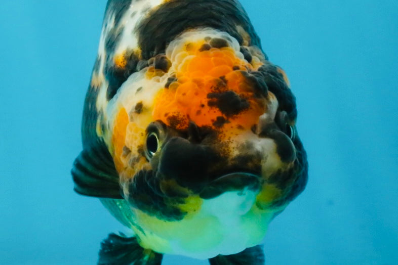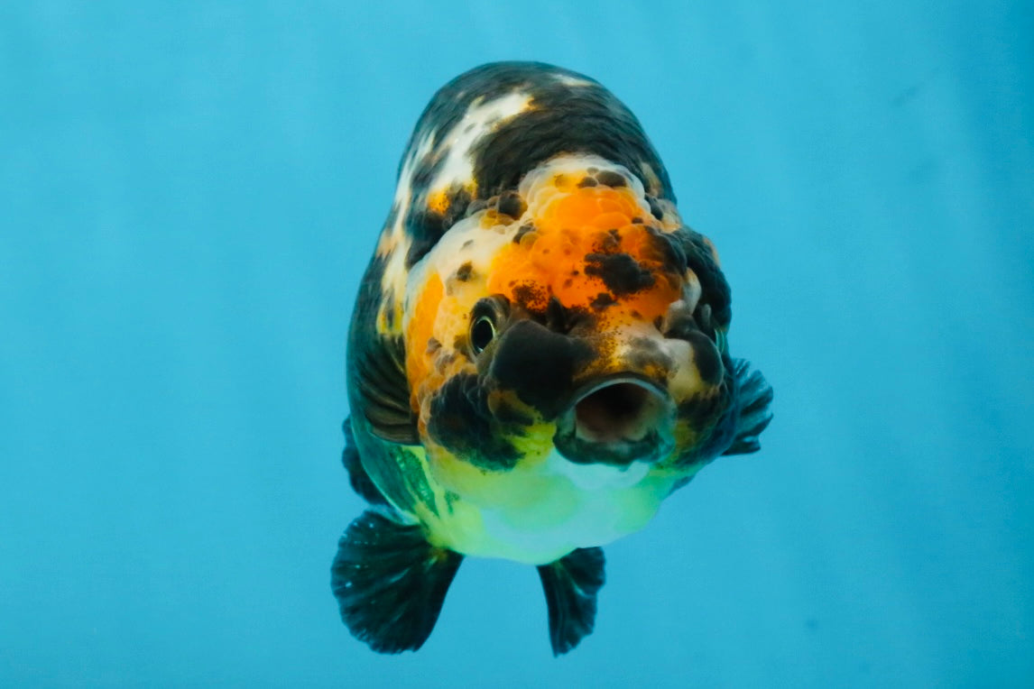 A chubby, well-balanced Ranchu with rich calico tones and a smooth swim. Strong body, clean back, and great growth potential. A cozy little showpiece with classic Ranchu charm.