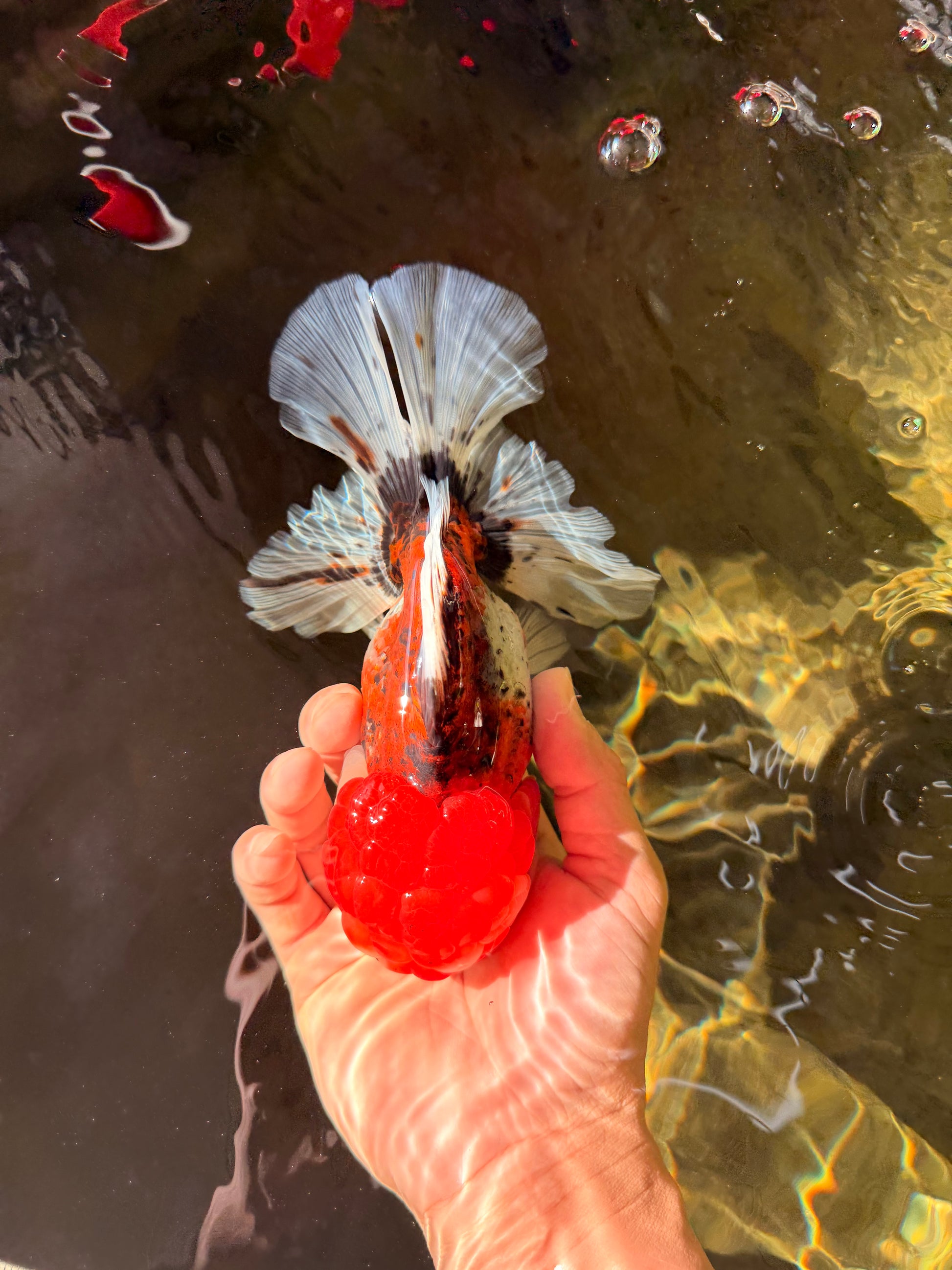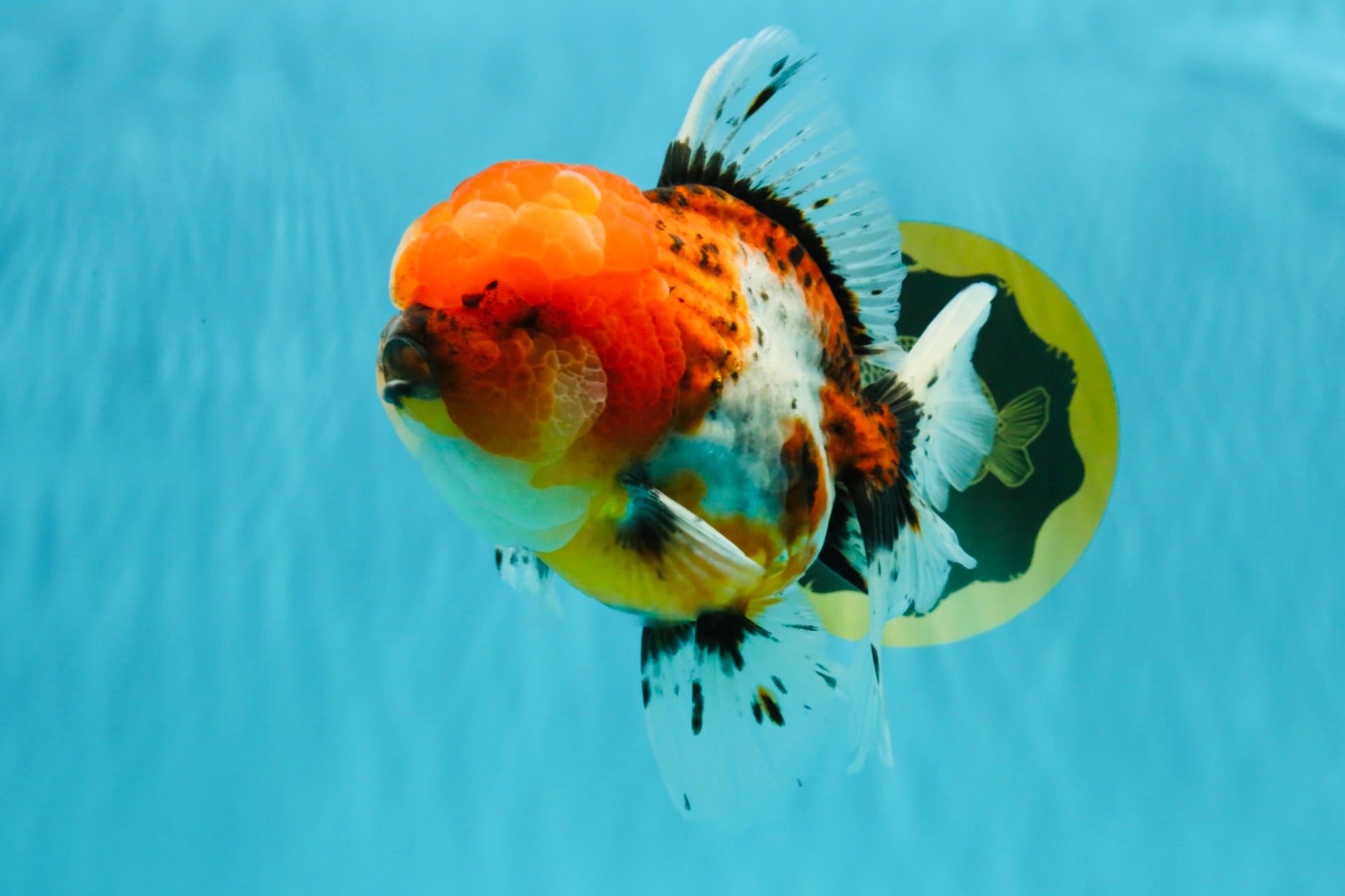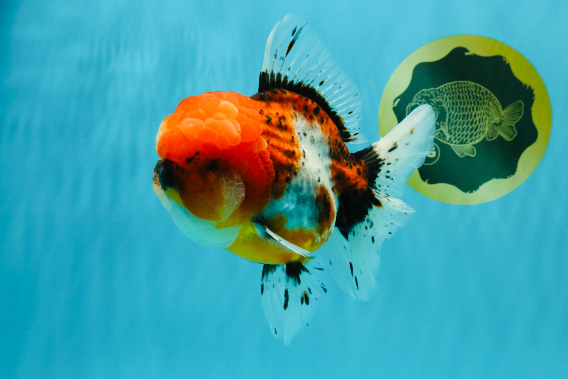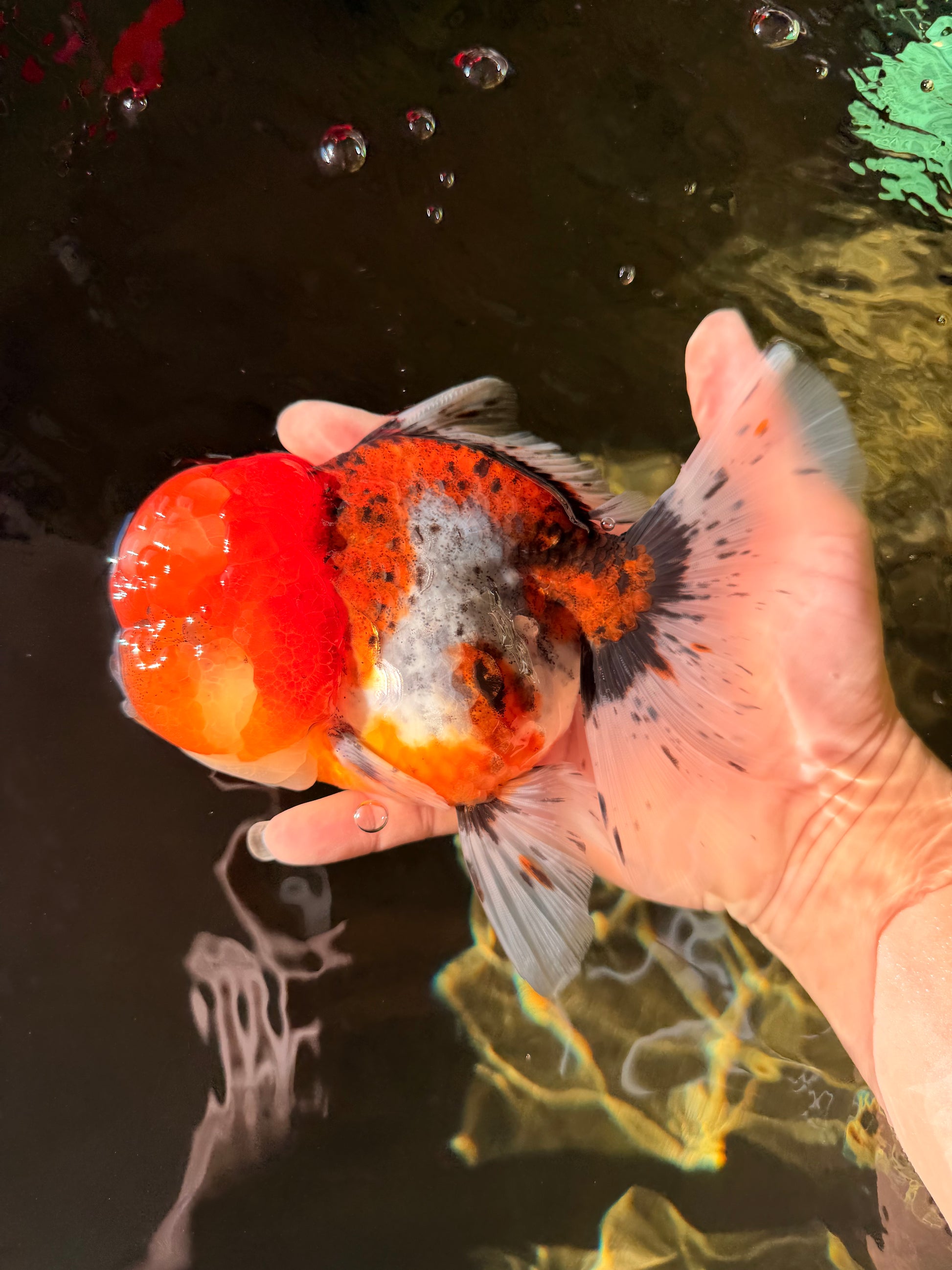 Large frame with vibrant calico mix and strong body depth. Graceful fins and confident swim style. A beautiful show-size Oranda.