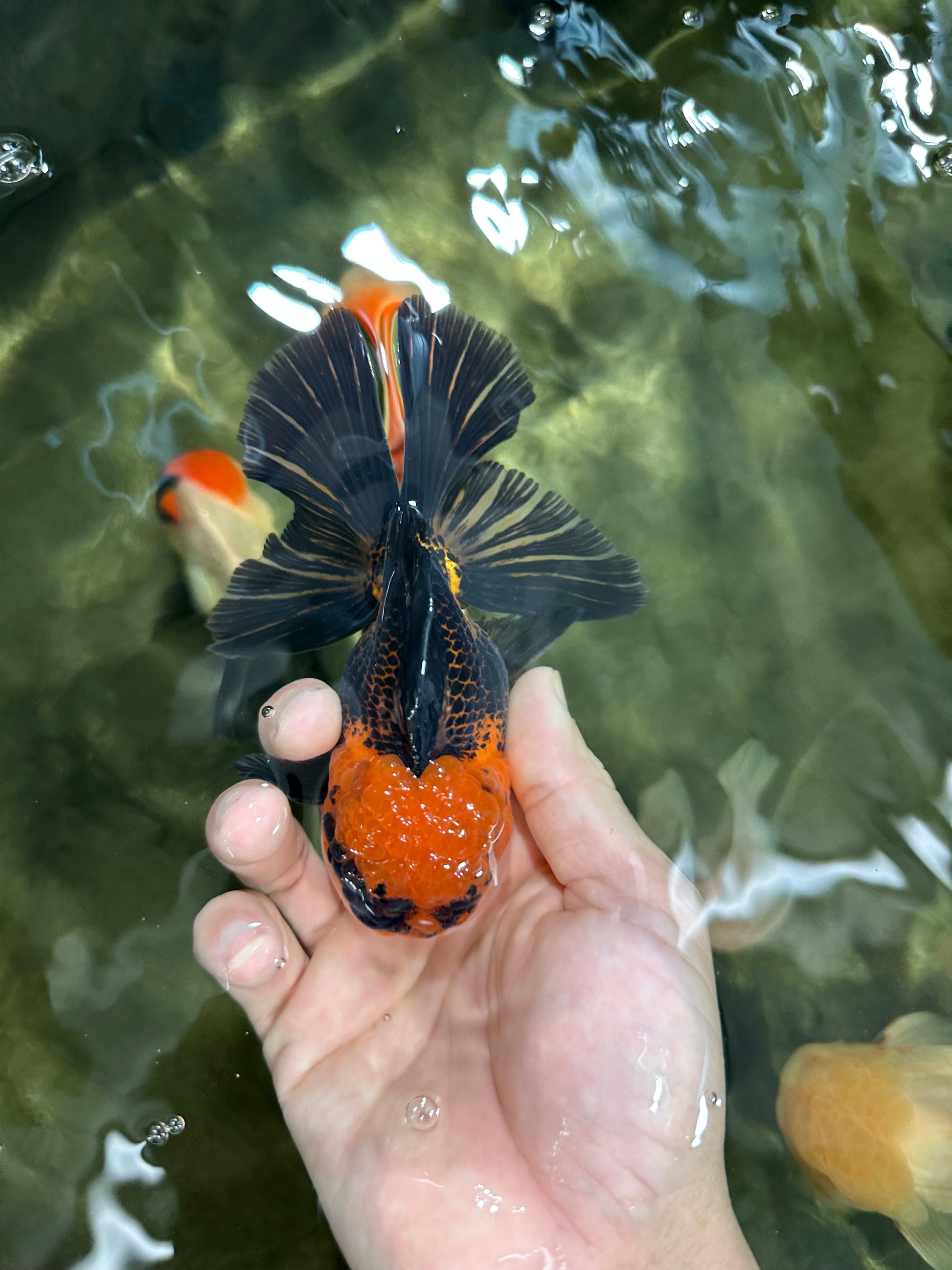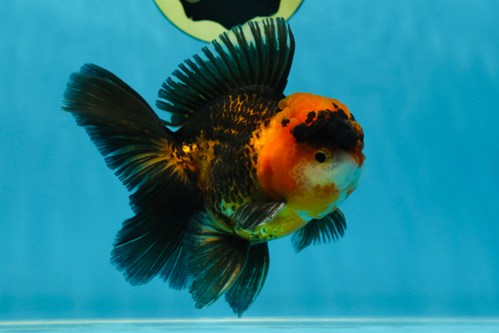 🐉 Fierce in both color and energy, this tricolor Oranda is an eye-catcher with fire in his fins and premium posture to match.