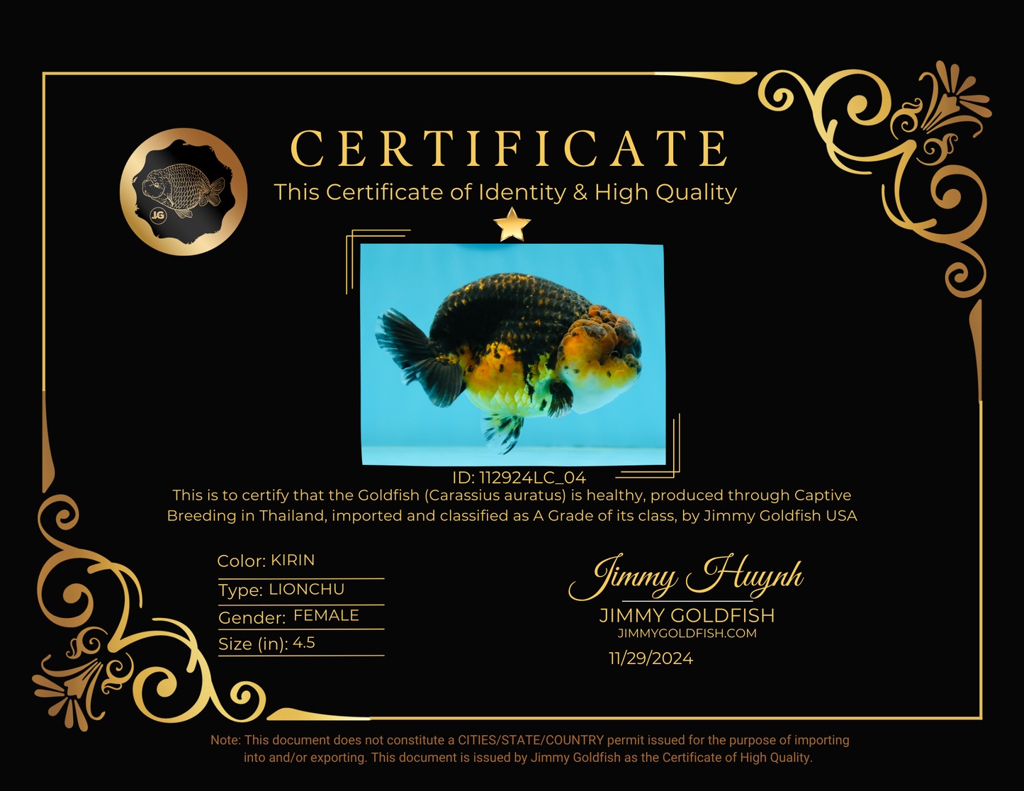 Grace your tank with the A Grade Kirin LionQueen! Measuring 4.5 inches, its vibrant kirin patterns and regal demeanor bring an exotic flair to your aquarium. Premium quality, healthy, and full of personality—it's #JimmyStyle all the way.