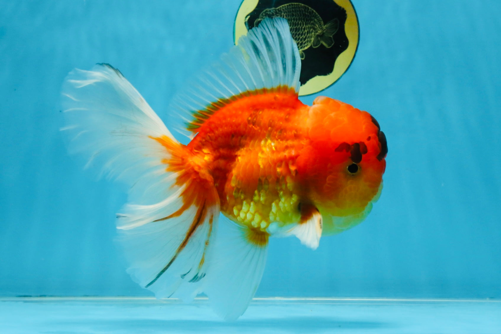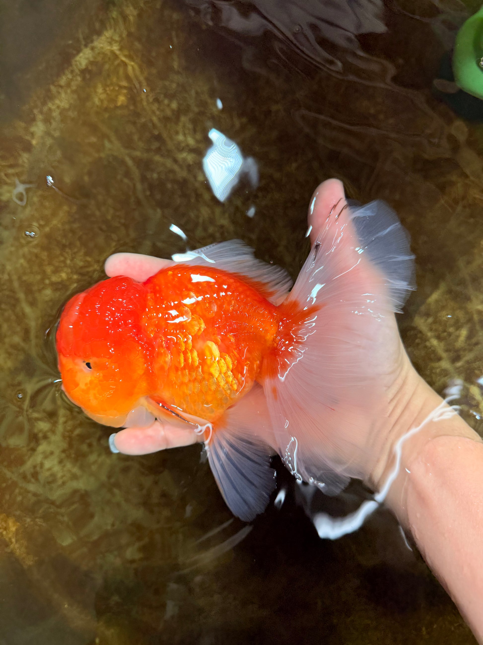 Large Sakura Oranda with soft red-on-white tones and graceful movement. Thick body and excellent growth potential. Elegant, calm, and quietly premium.