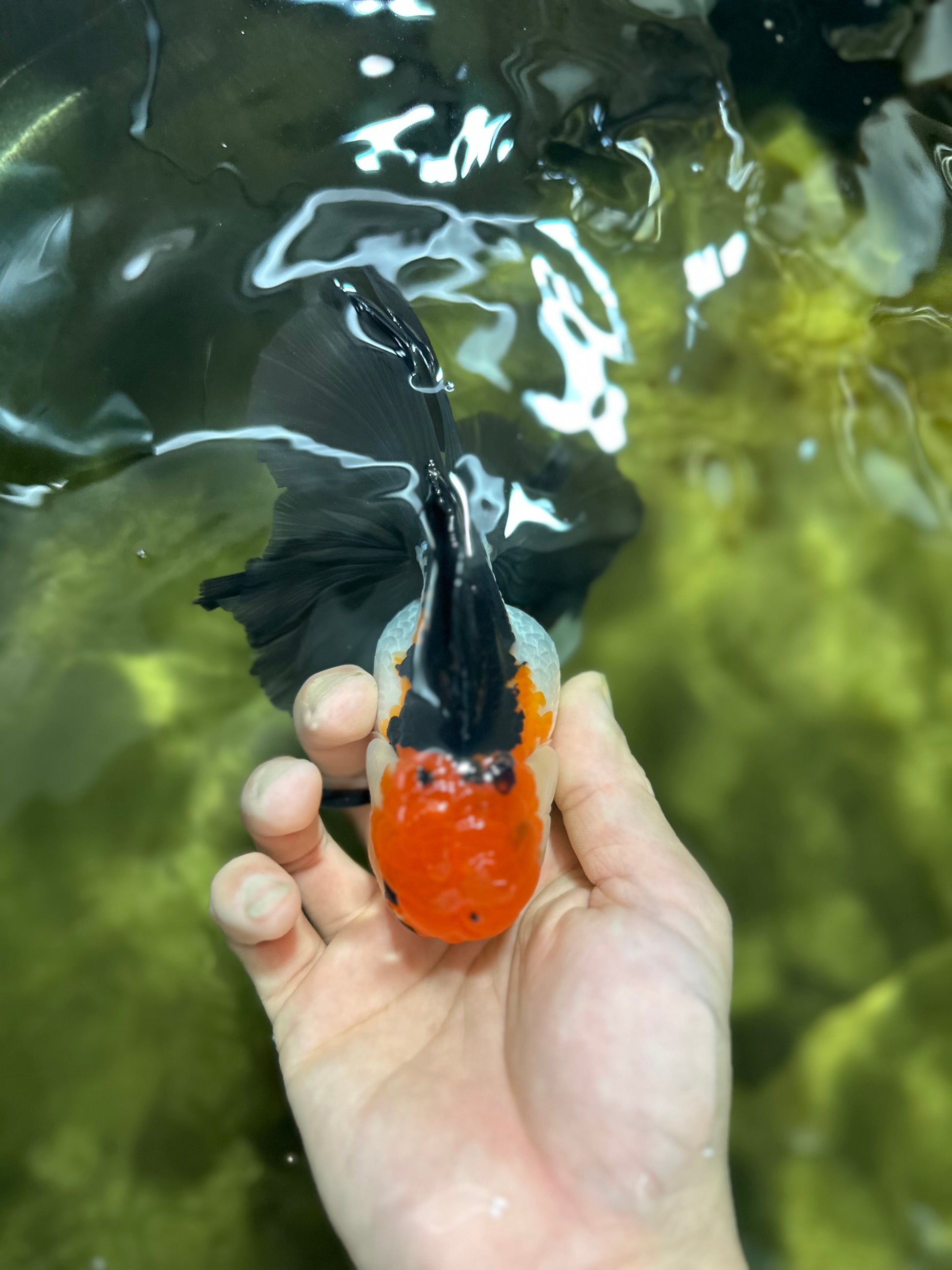 Fluffy Tail A Grade Tricolor Oranda Female – a graceful beauty with flowing tail and striking red, white, and black colors, full of charm and elegance.