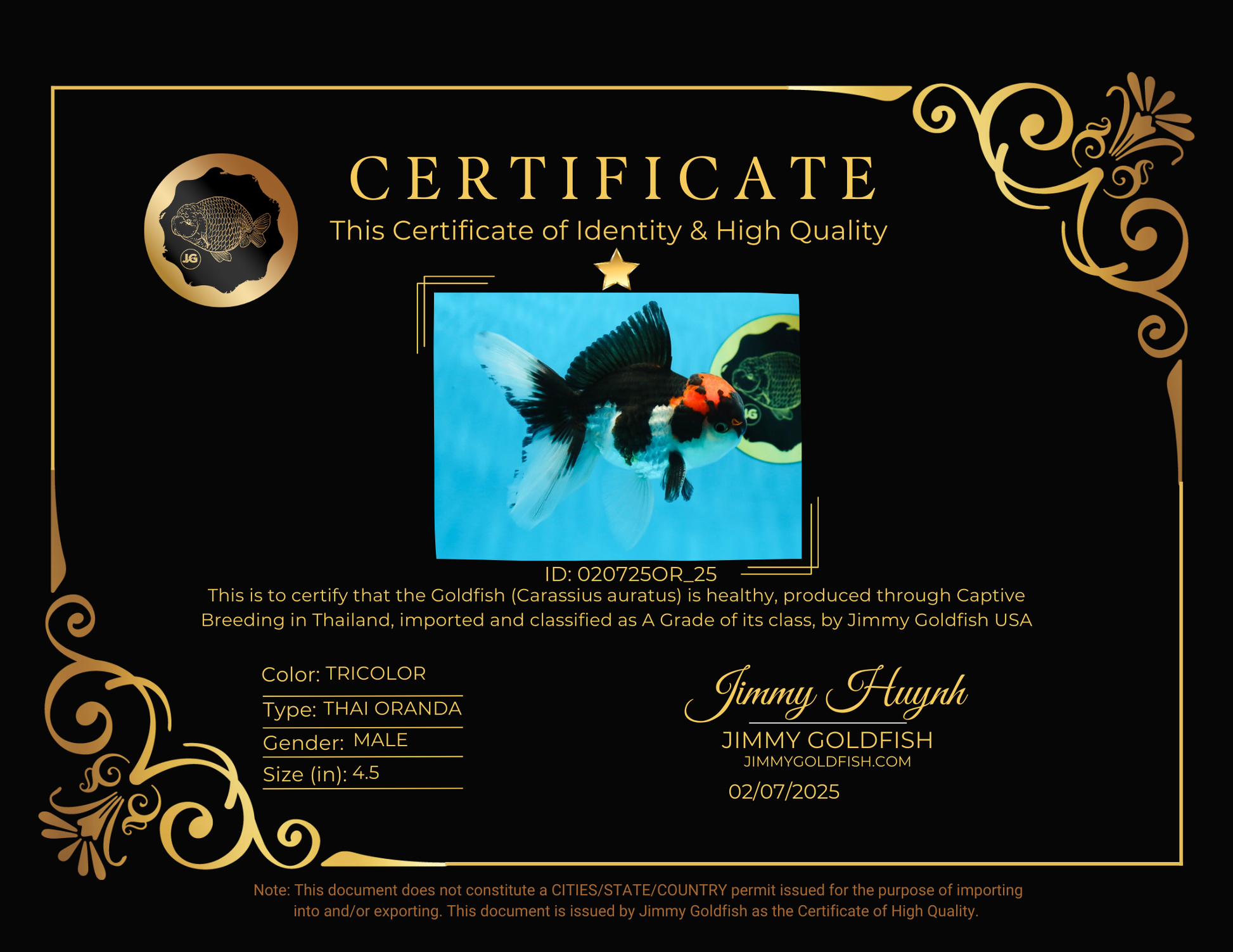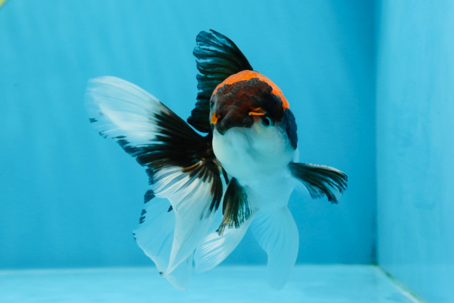 A compact 4.5-inch Oranda with bold tricolor patterns. Healthy, active, and a perfect addition to any #JimmyStyle tank.