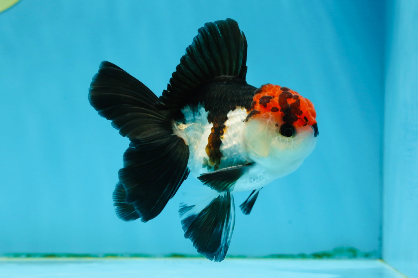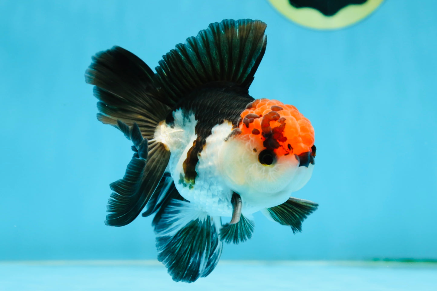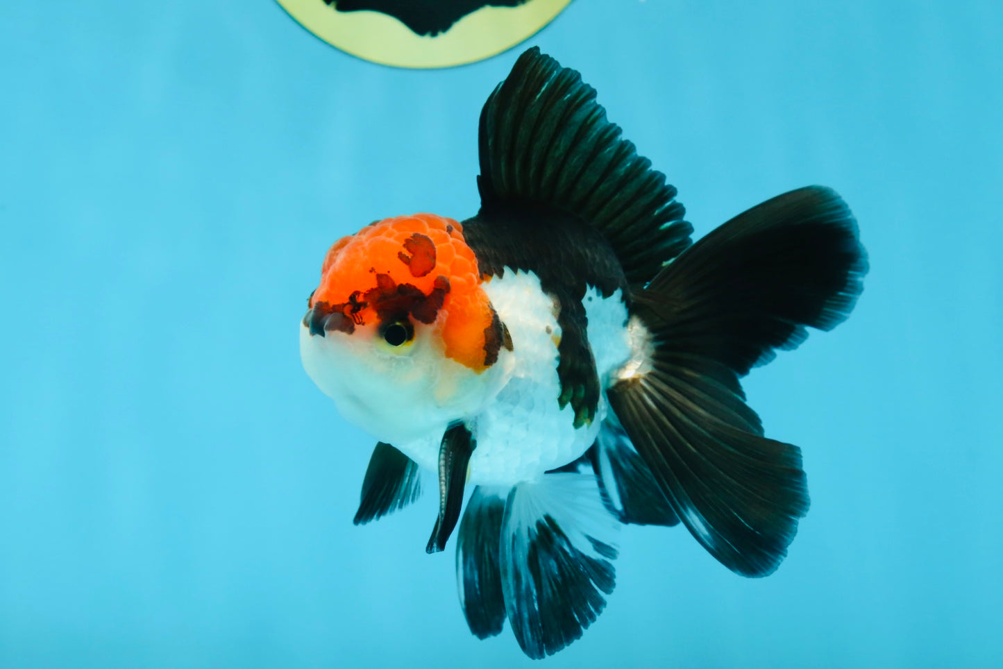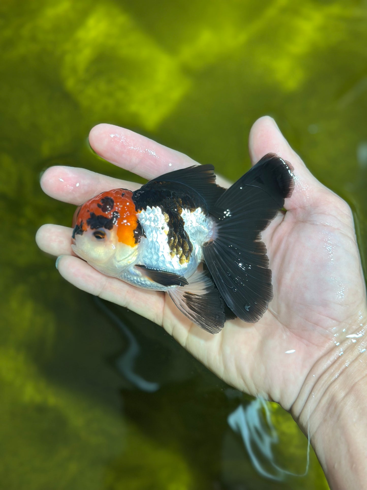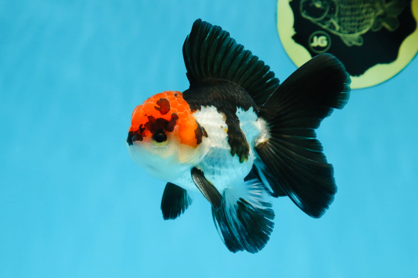 This Oranda showcases a mix of black, white, and orange hues in perfect harmony. A balanced swimmer with a bold personality. #JimmyStyle