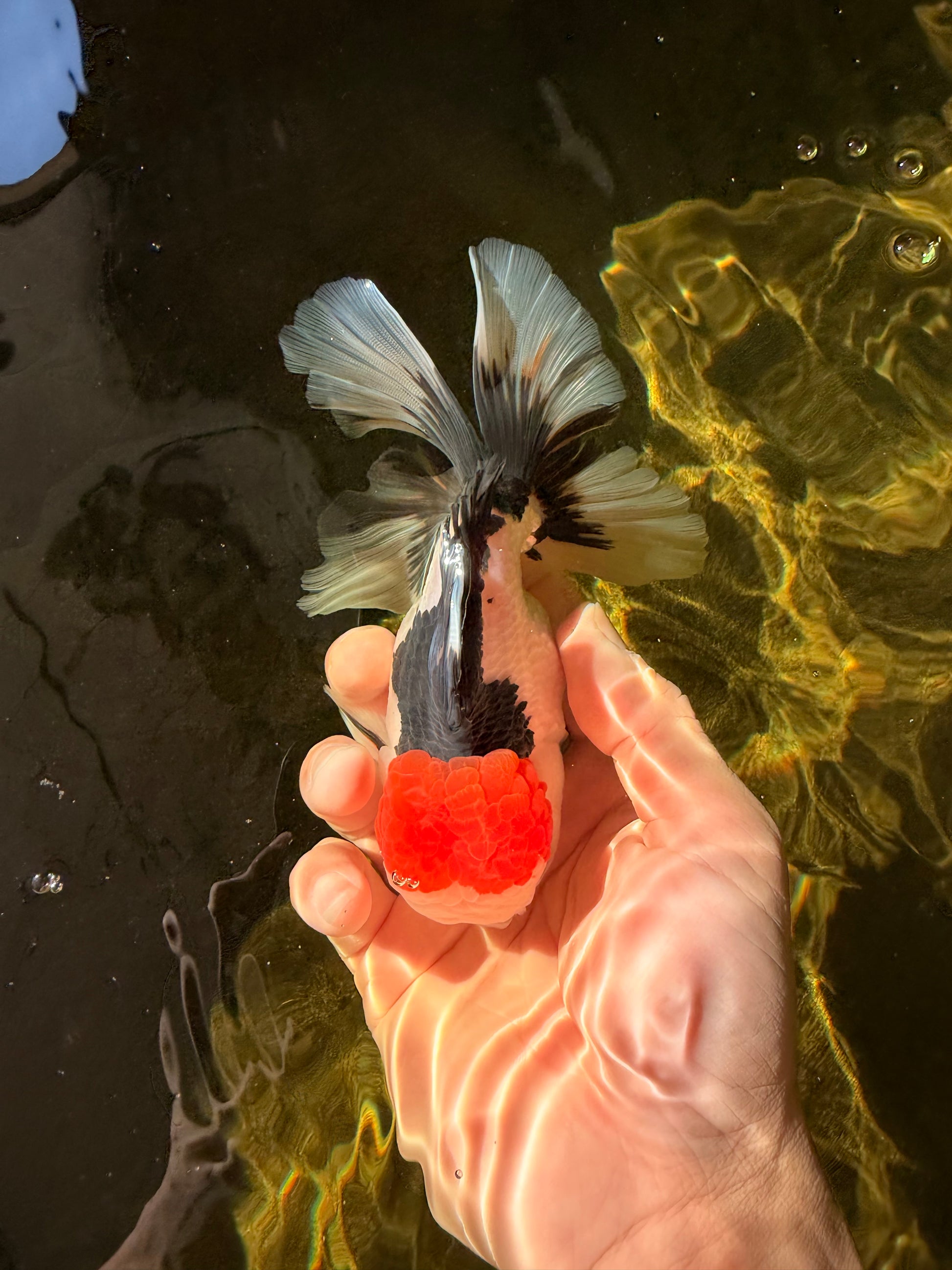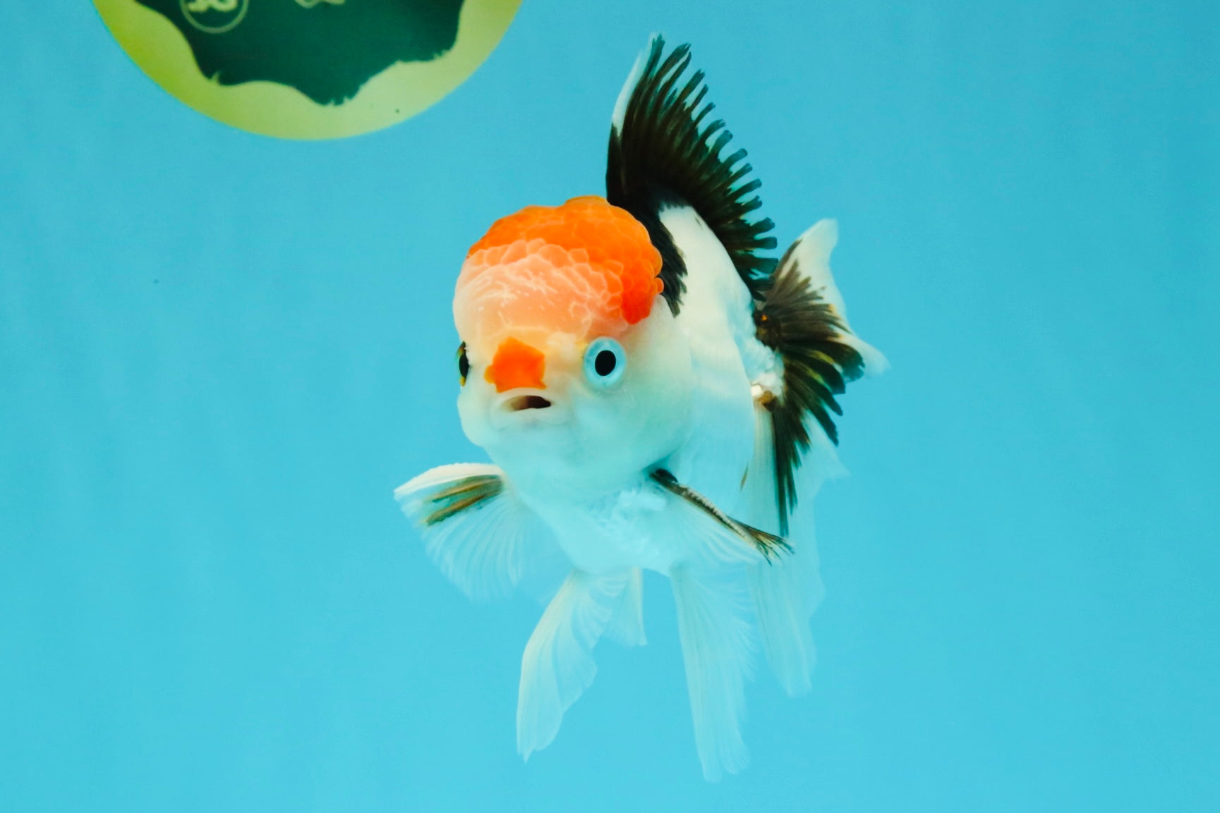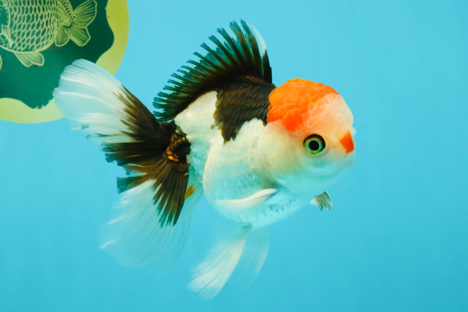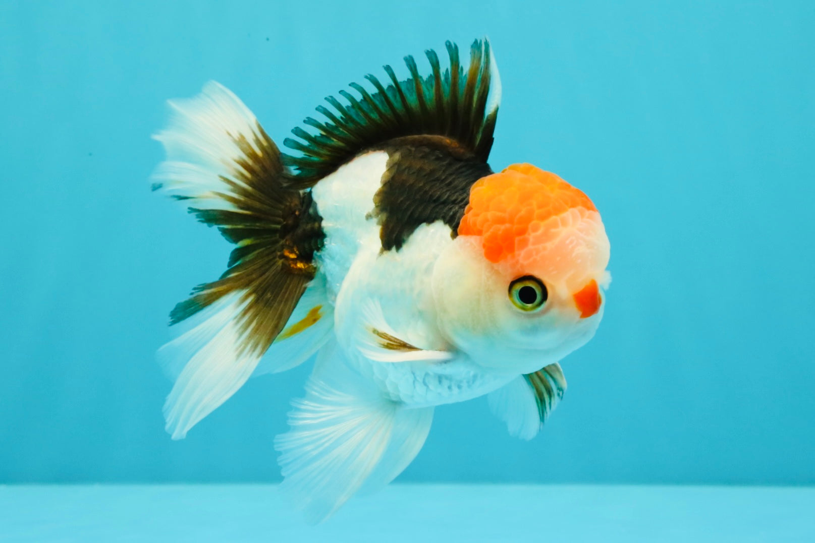Bright tricolor pattern with balanced Oranda body and wen. Smooth fins and steady swim. A lively and eye-catching fish.