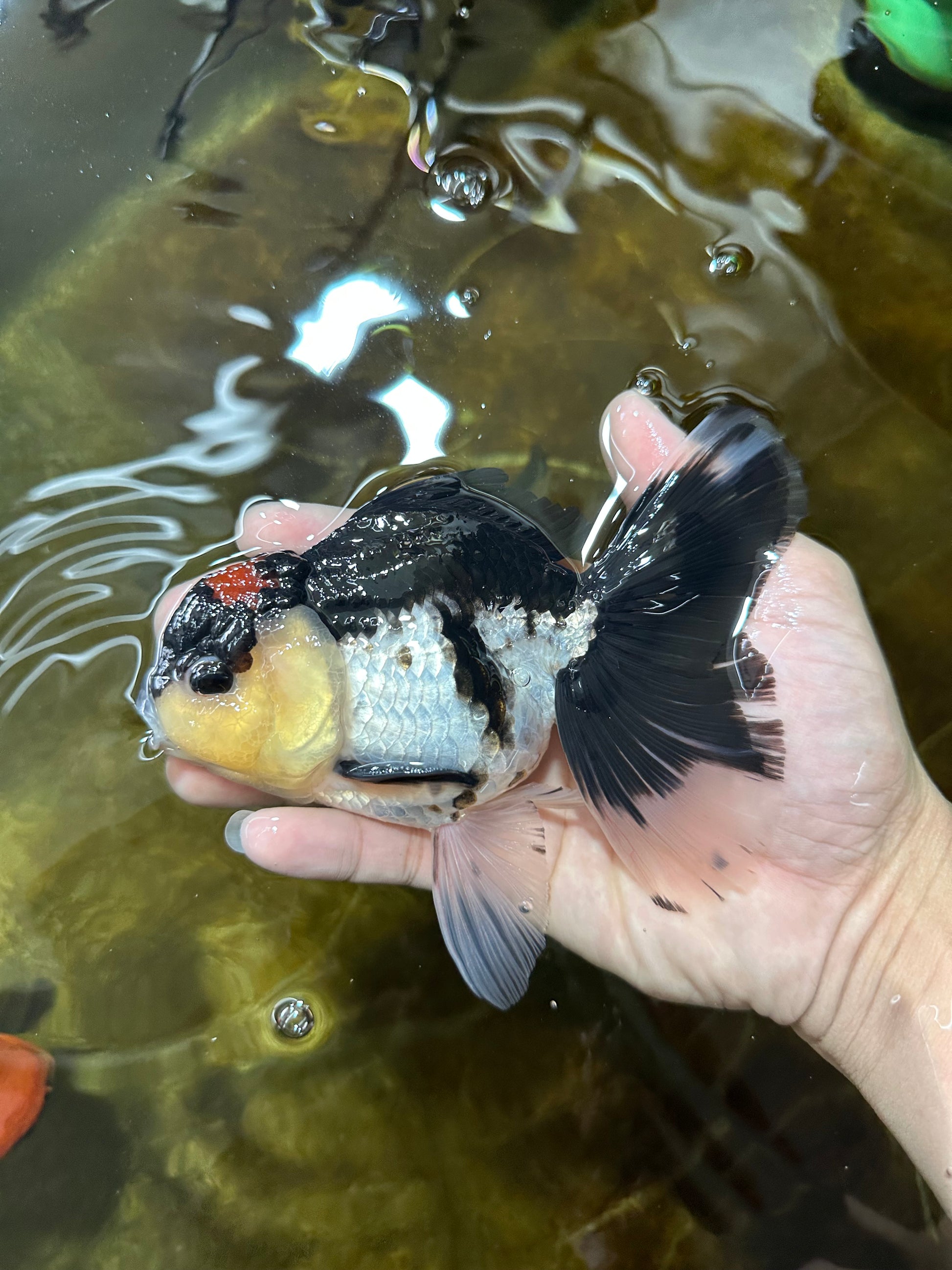 With slightly more size and presence, this tricolor beauty brings balance and grace to every glide. Perfect for mixed fancy goldfish tanks.