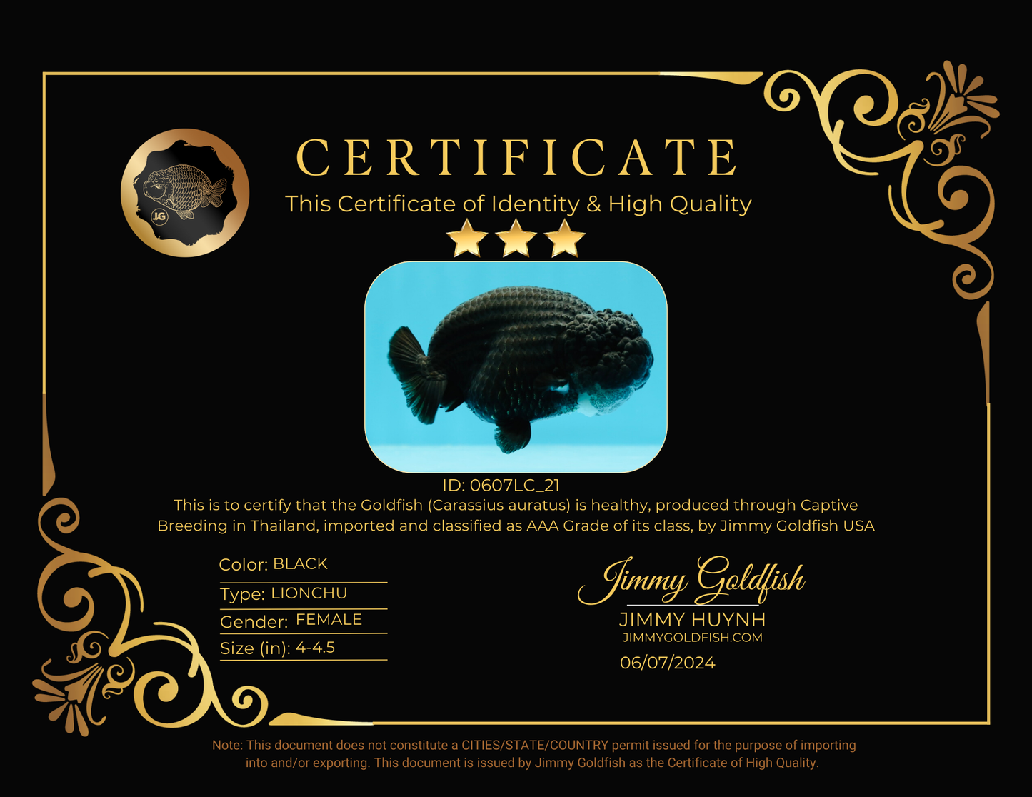 Introducing the AAA Grade Black LionQueen, a premium goldfish with a unique color mark, chunky body, and rounded belly. This Jimmy Style fish is super healthy and boasts a lovely character. With high quality and beauty, it's truly a must-have for any goldfish enthusiast!