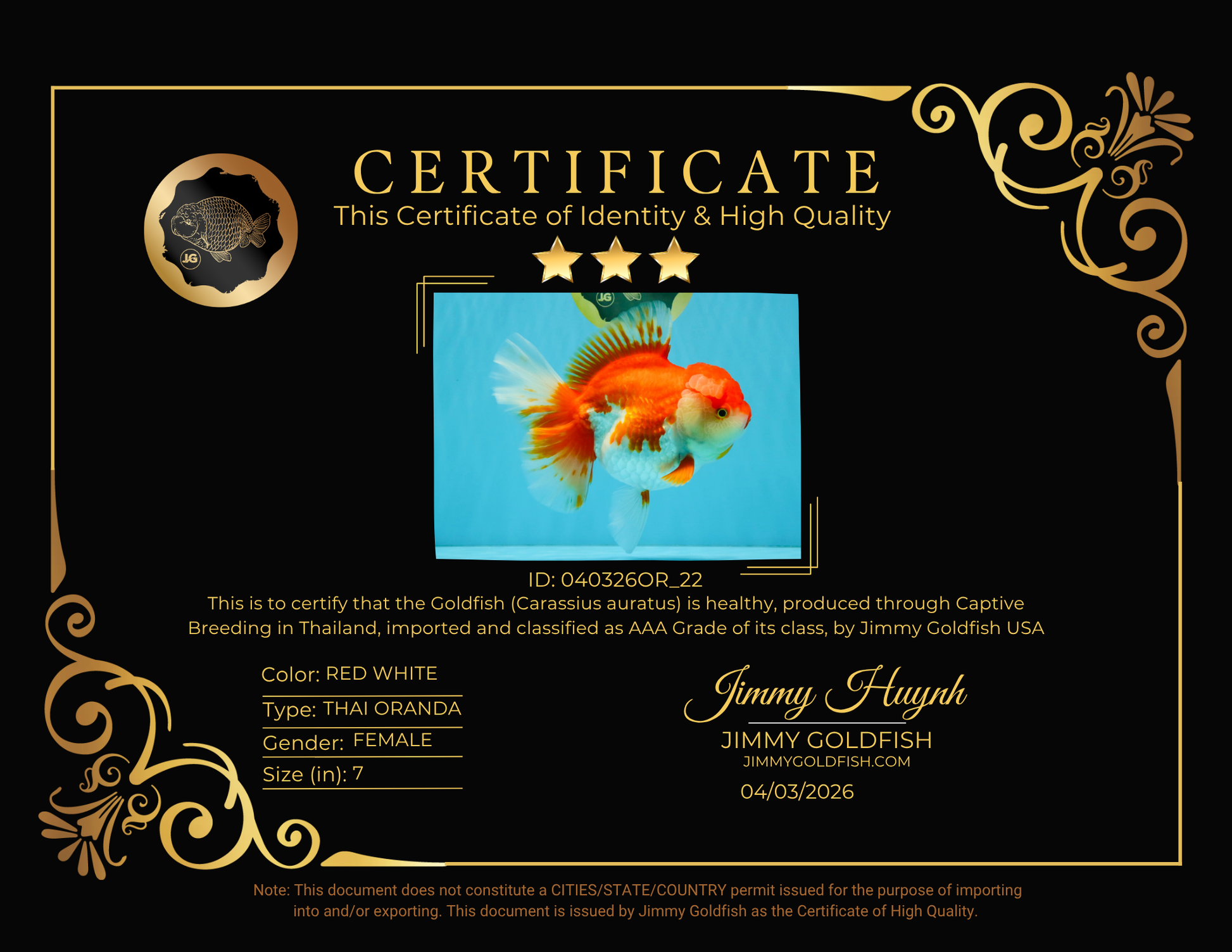 Health: Every fish has completed our strict quarantine procedure. Healthy and active condition. Disease-free guarantee.
