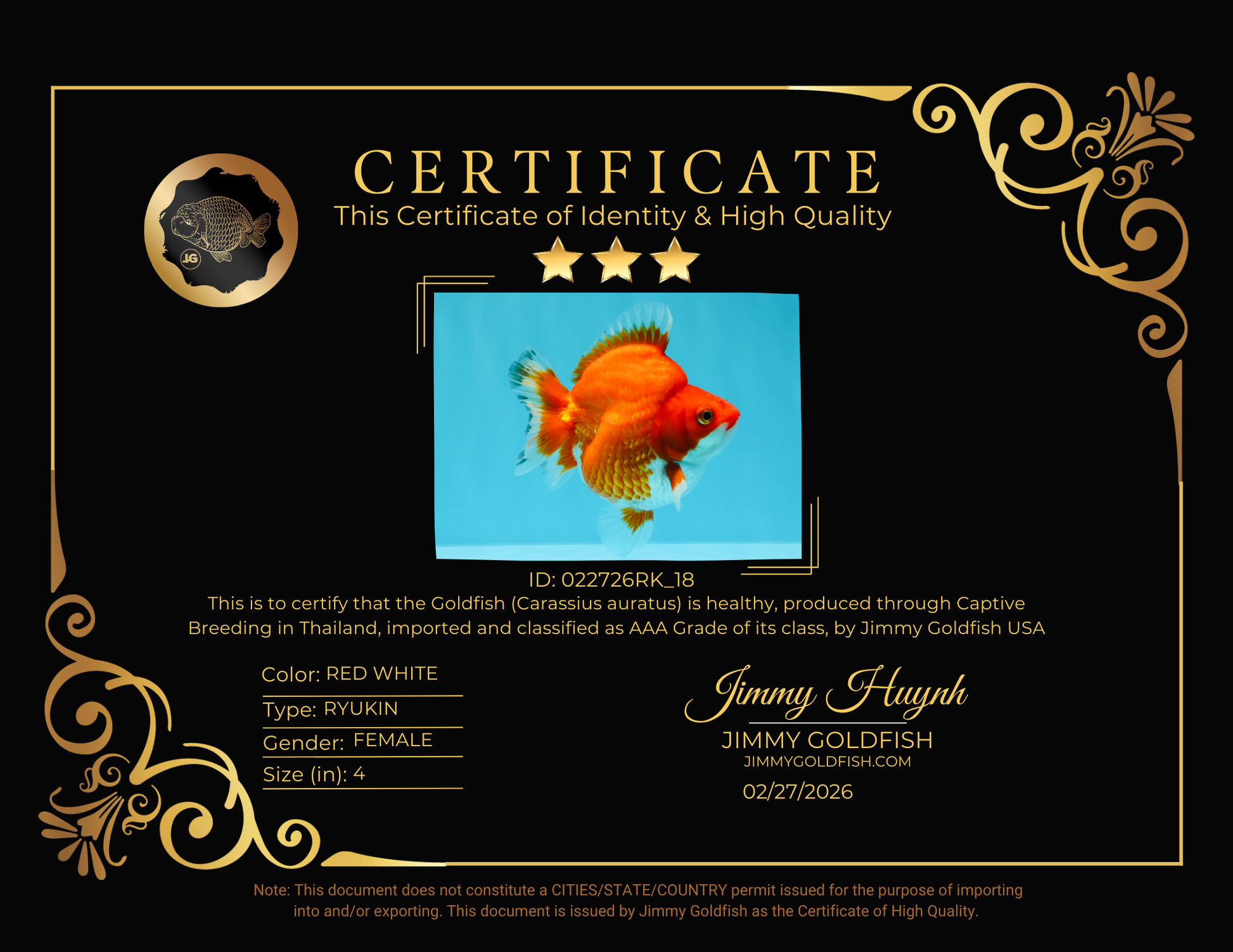 AAA Grade Red White Ryukin Female 4 inches #022726RK_18