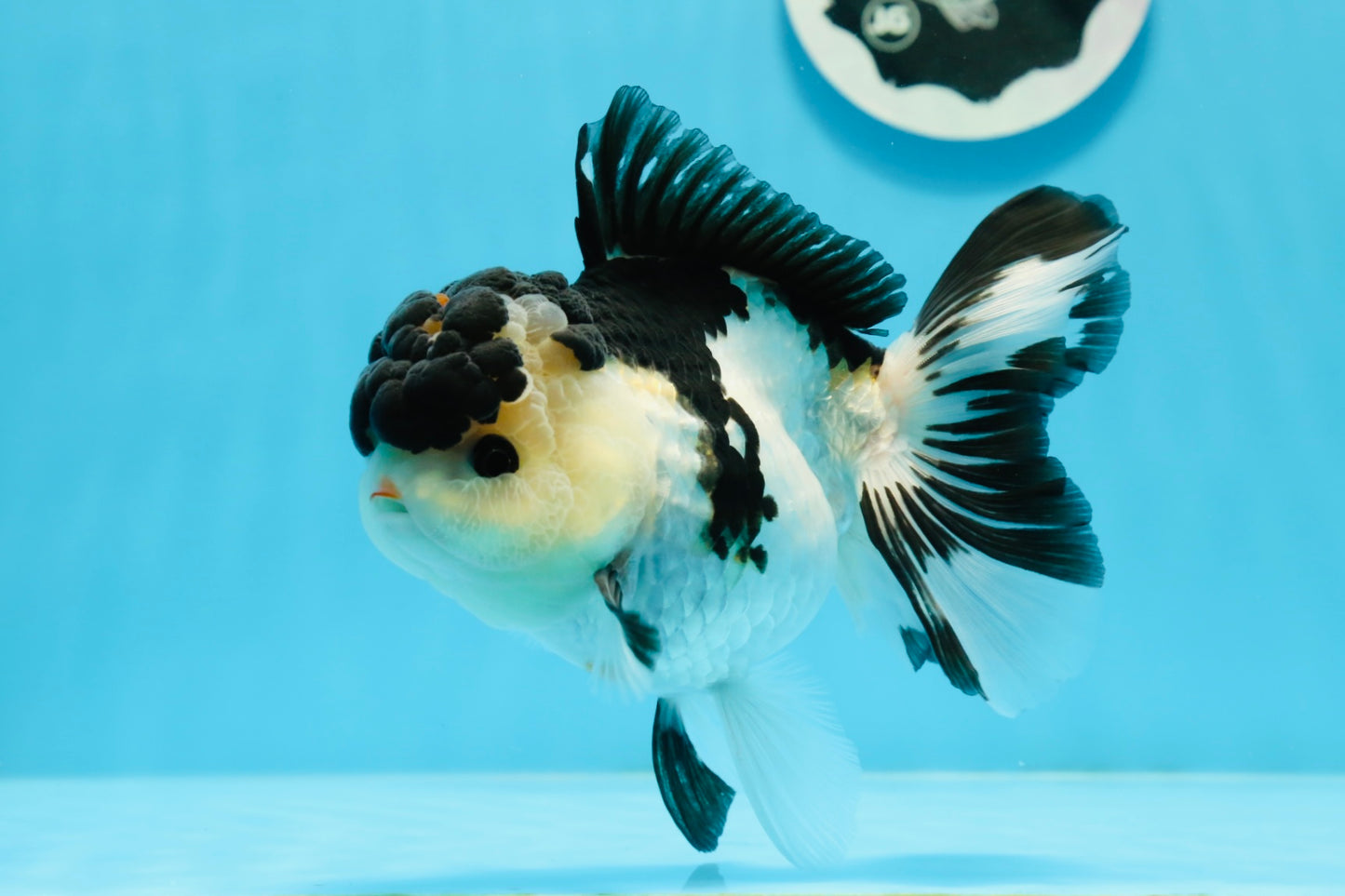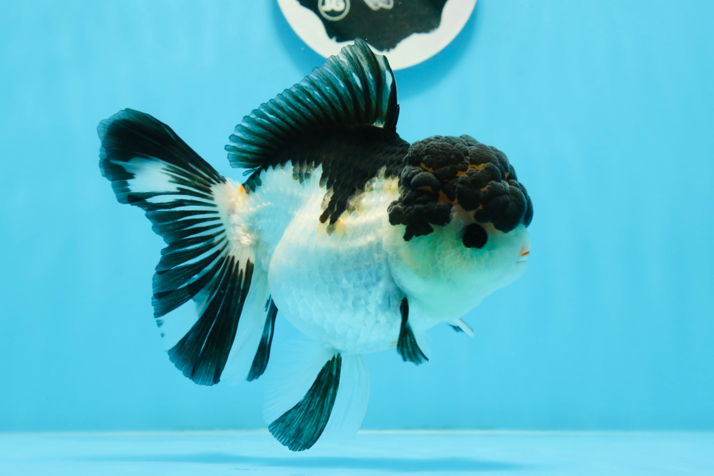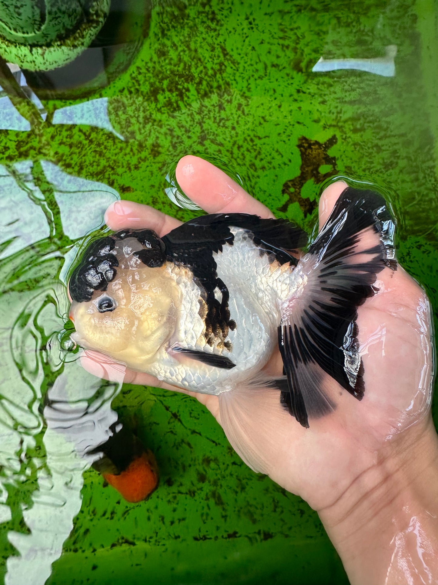 Get ready to fall in love with this AAA Grade Tricolor Button Eyes Oranda! With a unique panda color mark and button eyes, this high-quality goldfish has a beautiful and chunky body, rounded belly, and lovely character. Plus, she's super healthy and high grade. #JimmyStyle strikes again!