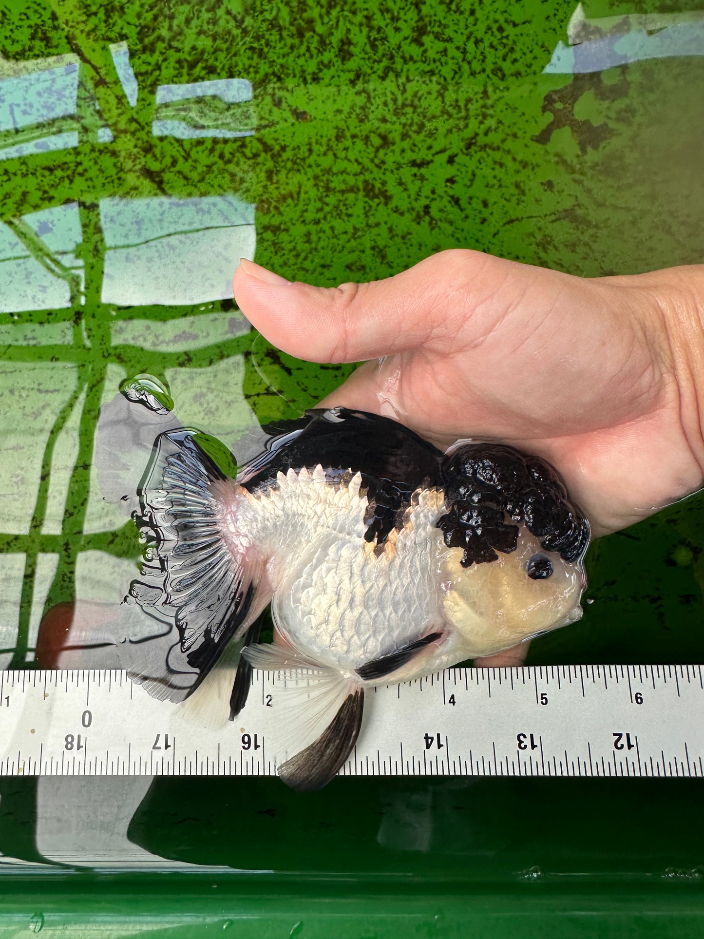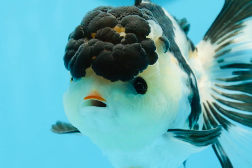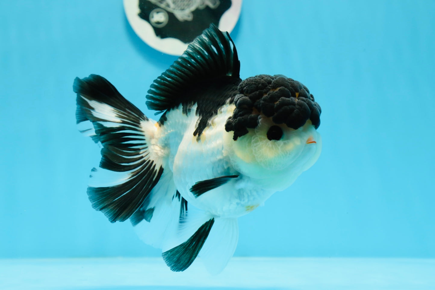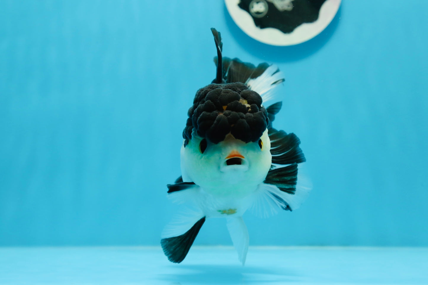 Get ready to fall in love with this AAA Grade Tricolor Button Eyes Oranda! With a unique panda color mark and button eyes, this high-quality goldfish has a beautiful and chunky body, rounded belly, and lovely character. Plus, she's super healthy and high grade. #JimmyStyle strikes again!
