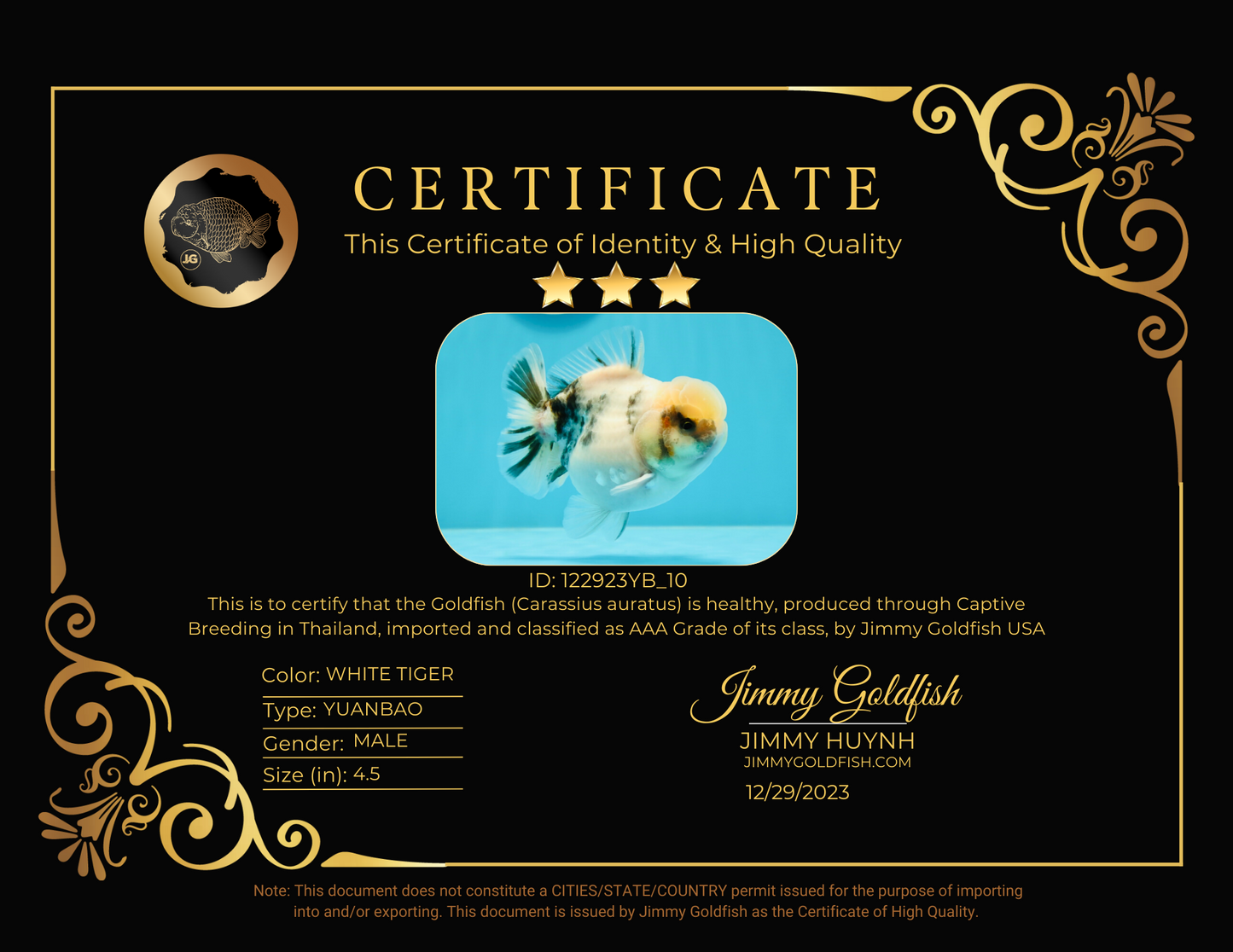 Unleash the inner ferocity of your aquarium with our AAA Grade White Tiger Yuanbao Male! With a unique color mark and chunky, rounded body, this 4.5-inch goldfish is a must-have for any high-quality tank. Keep it healthy and happy with Jimmy Style for maximum benefits. 🐅🐠 #122923YB_10