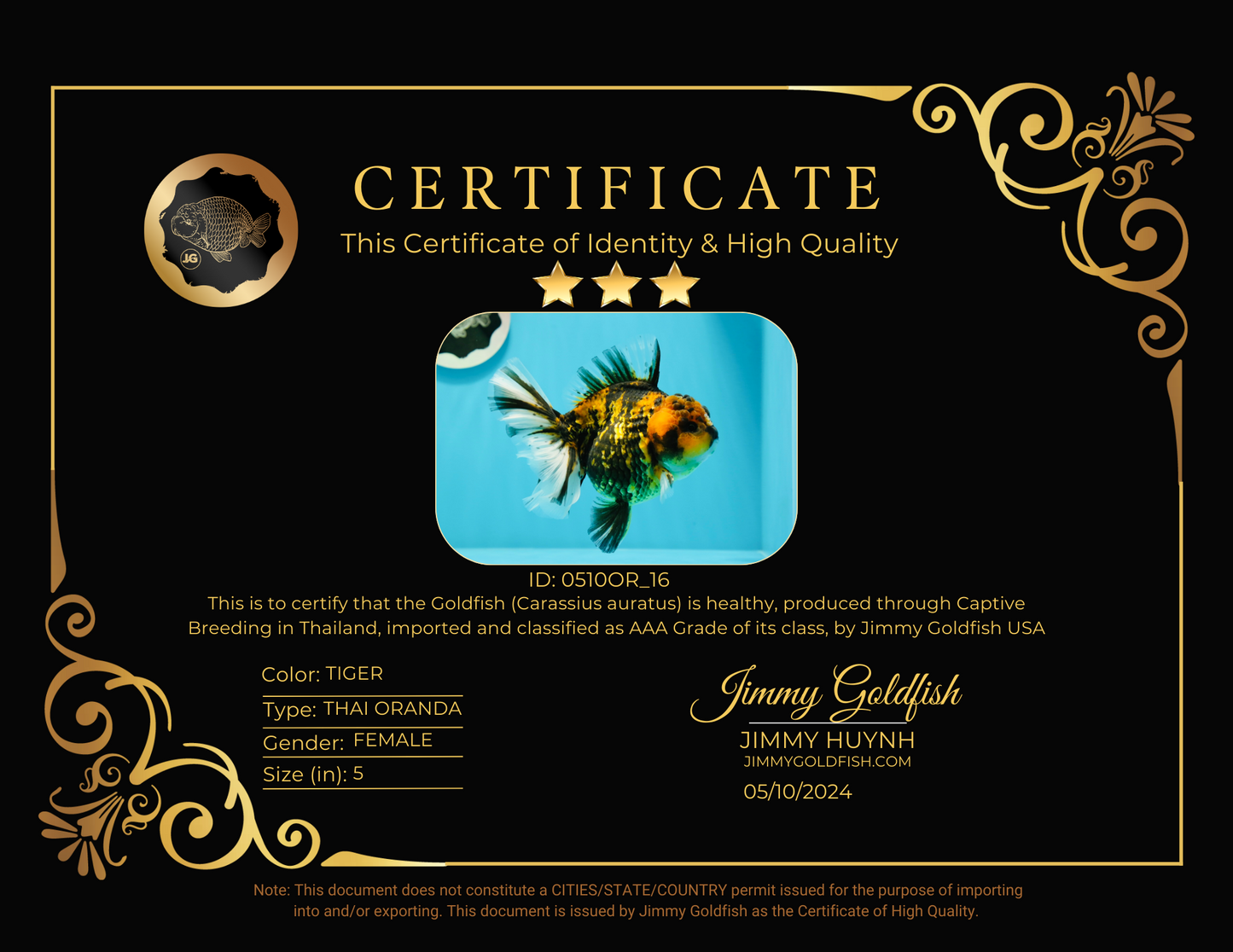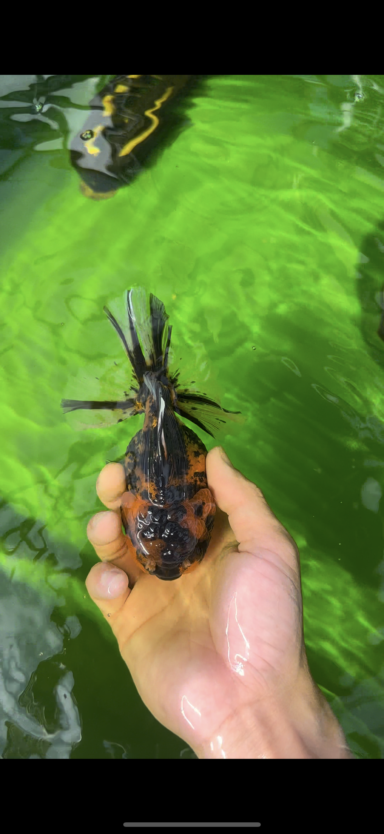 Introducing the playful 5" AAA Grade Young Godzilla Tiger Oranda Female #0510OR_16! With a unique color mark and chunky body, this high-quality goldfish will add a lovely and lively character to any aquarium. Super healthy and Jimmy Style-approved!