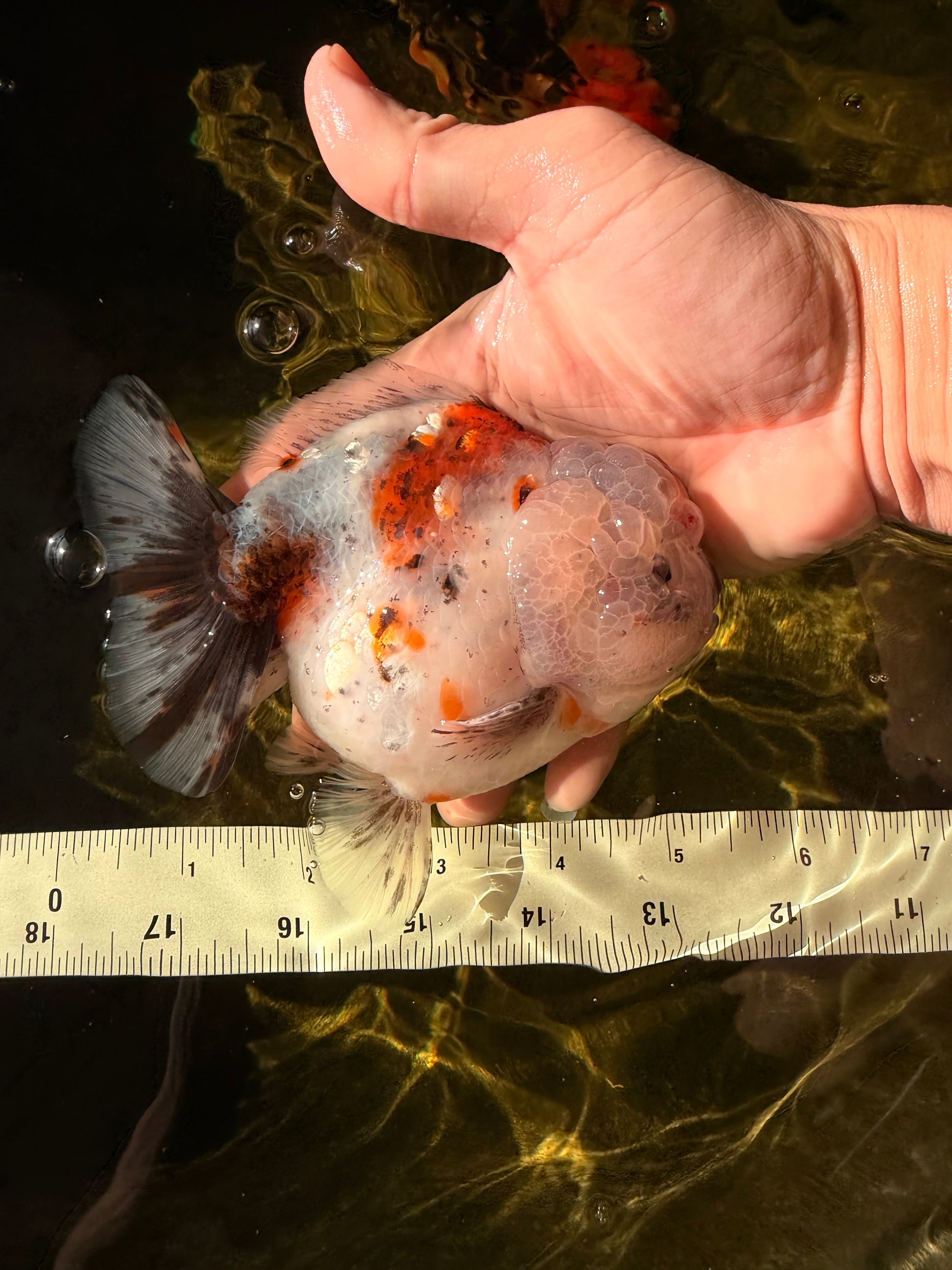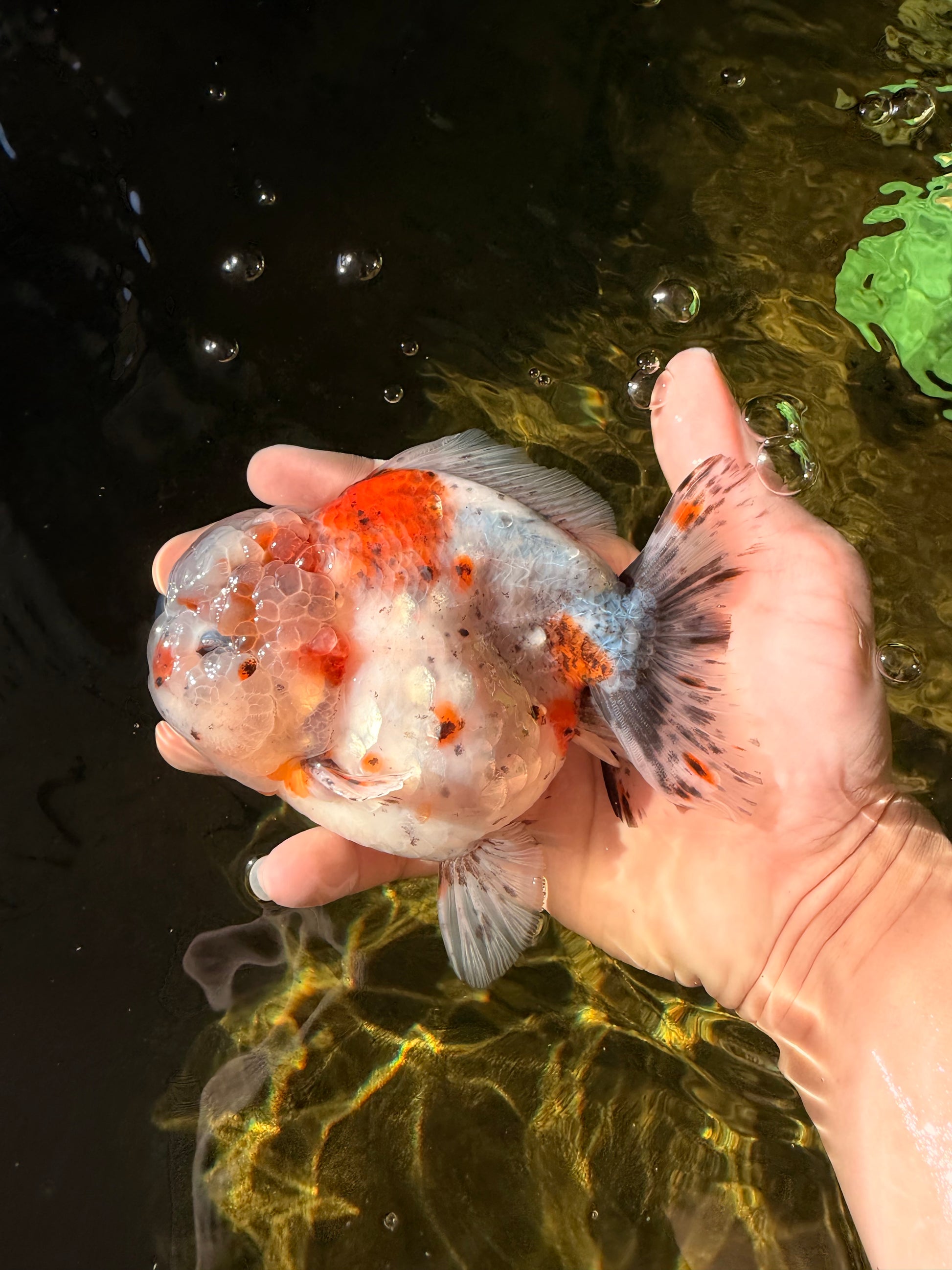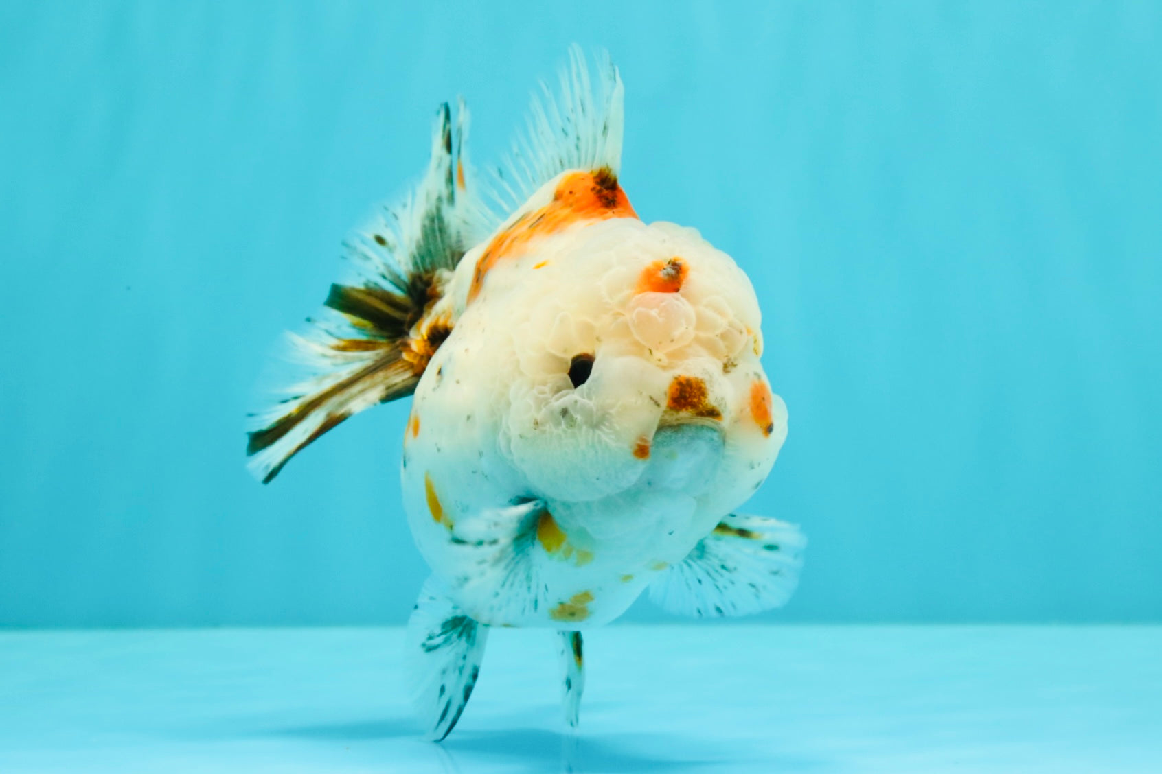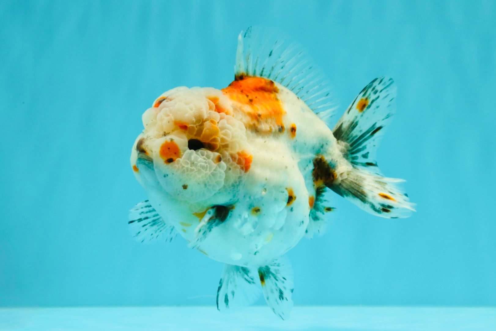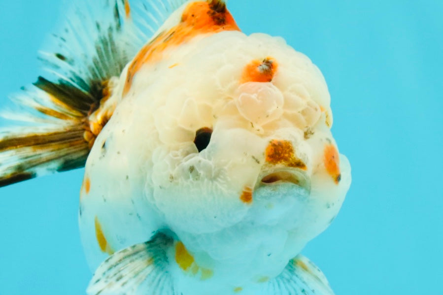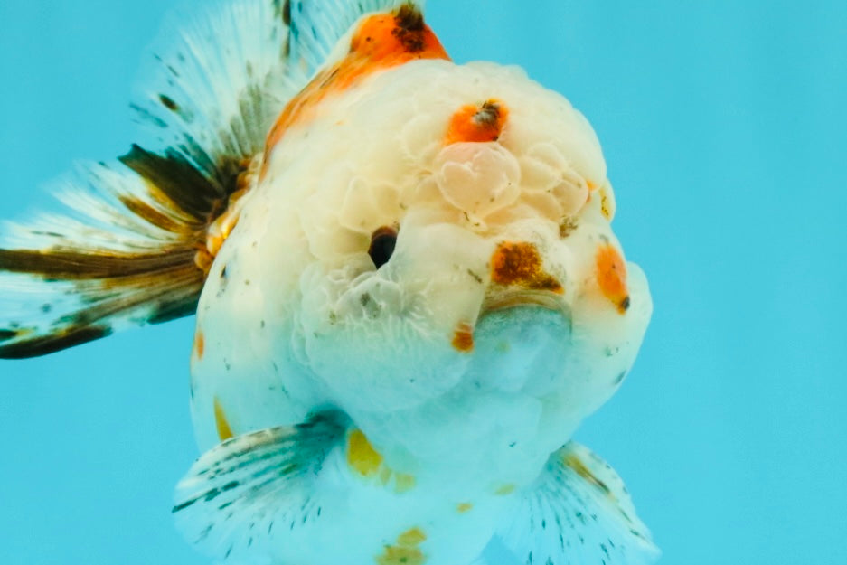 Chunky Yuanbao body with soft calico mix and round shape. Active and playful with good balance. A cute and colorful tank buddy.