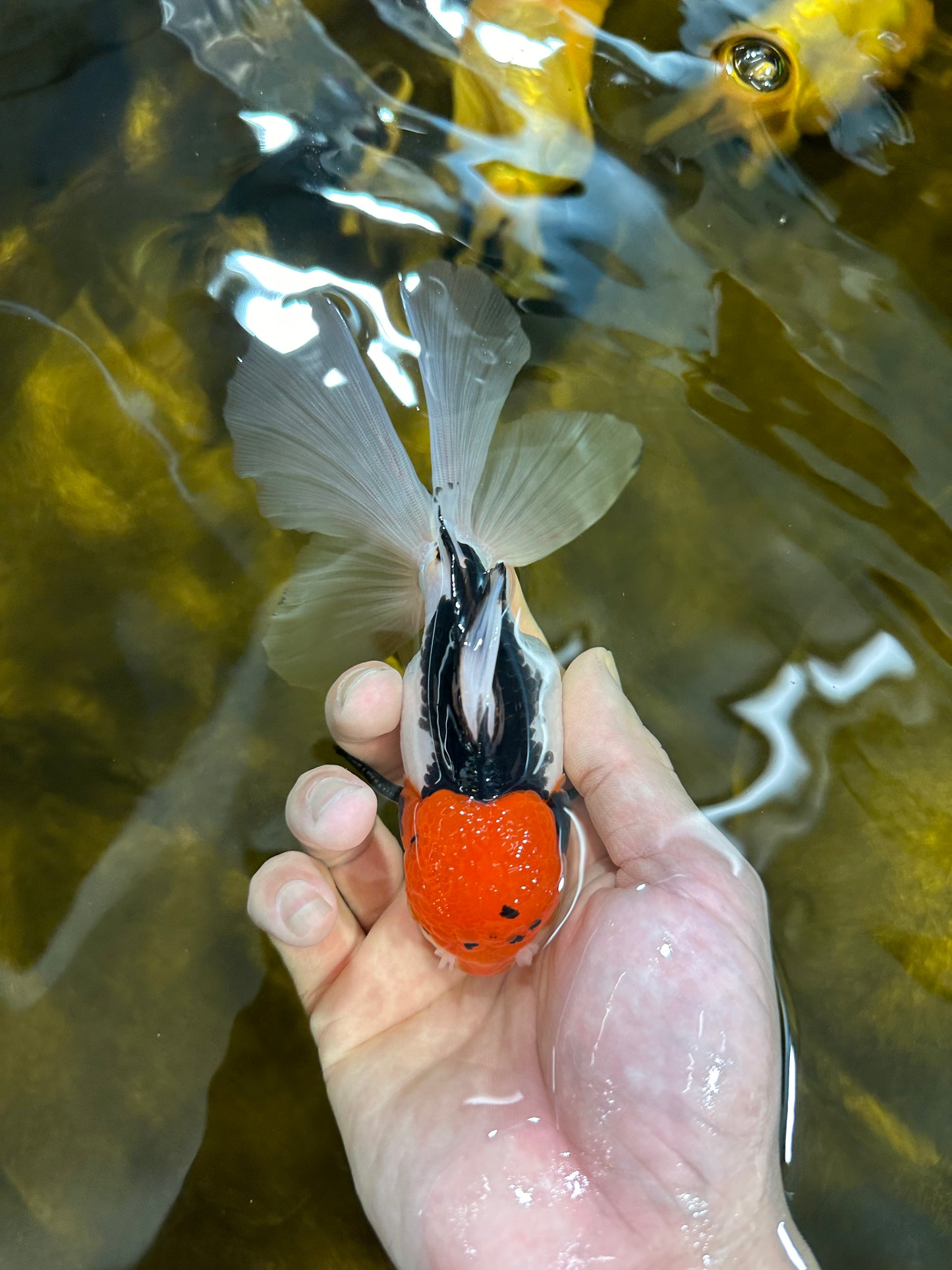 🔴 Looking for a unique, high-quality addition to your aquarium? Meet our A Grade Red Head Tricolor Oranda! With a lovely character, playful nature, and cute face, this premium goldfish is not only beautiful but also super healthy and young. Don't miss out on this high-grade selection! #0105OR_14