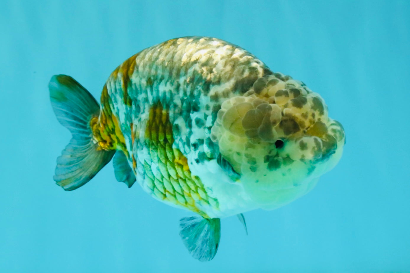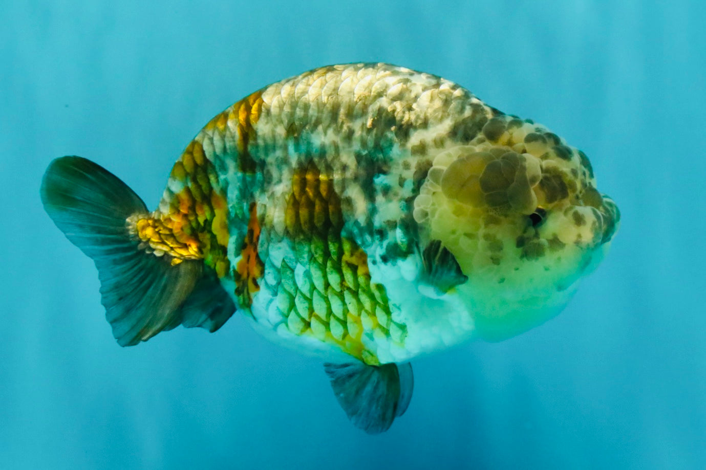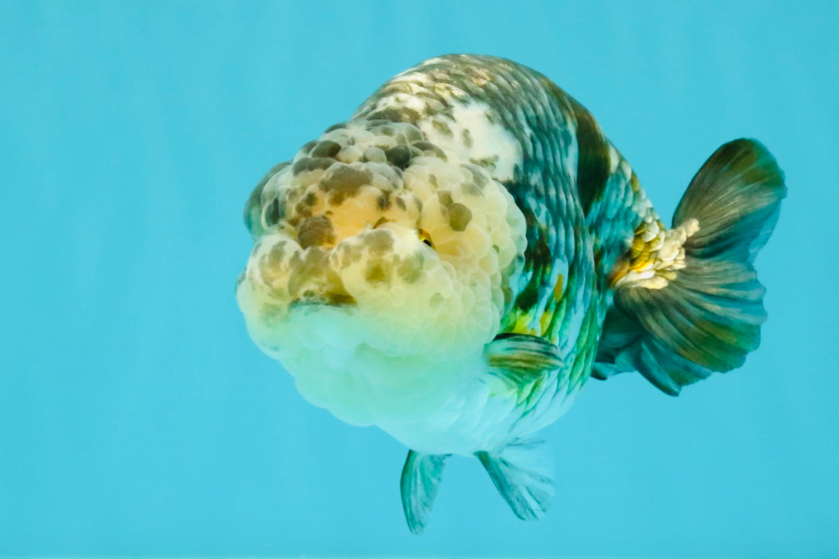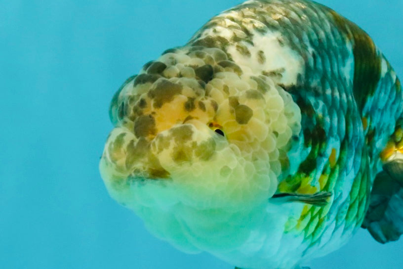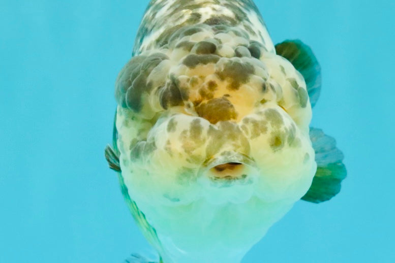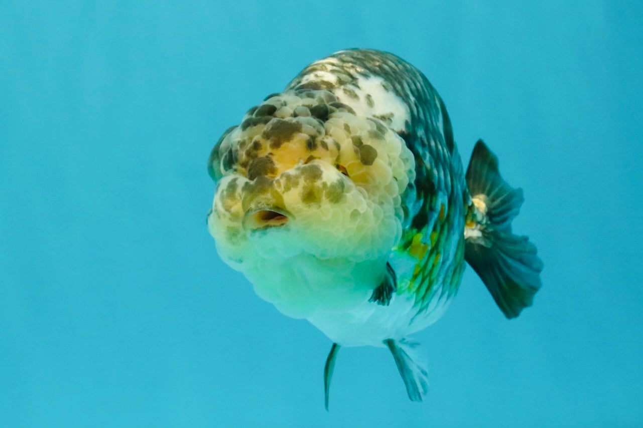Fine pepper calico pattern with smooth Ranchu curve. Strong body and calm swim style. A refined Ranchu beauty.