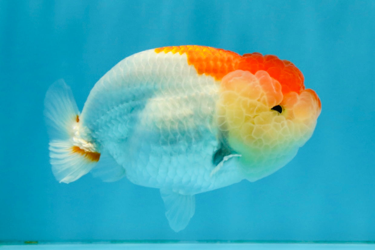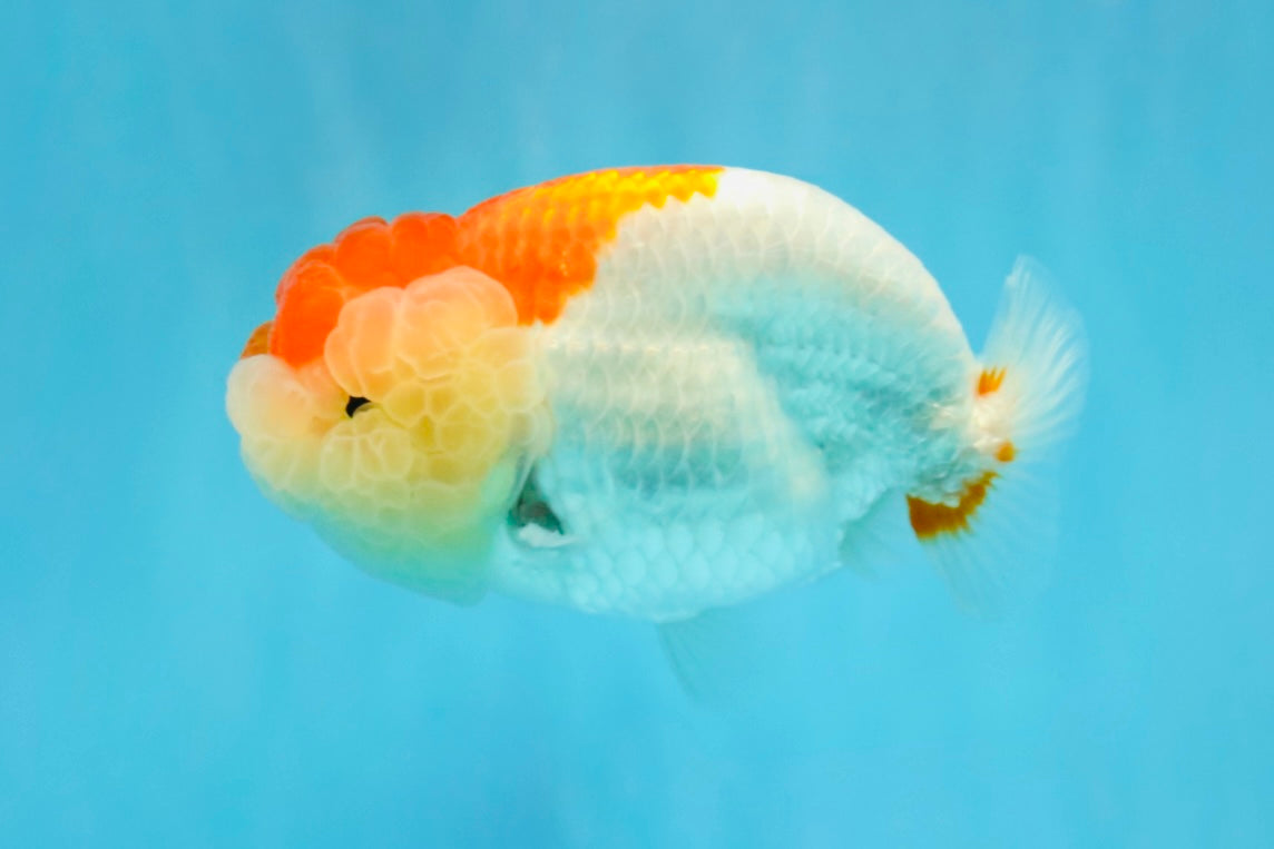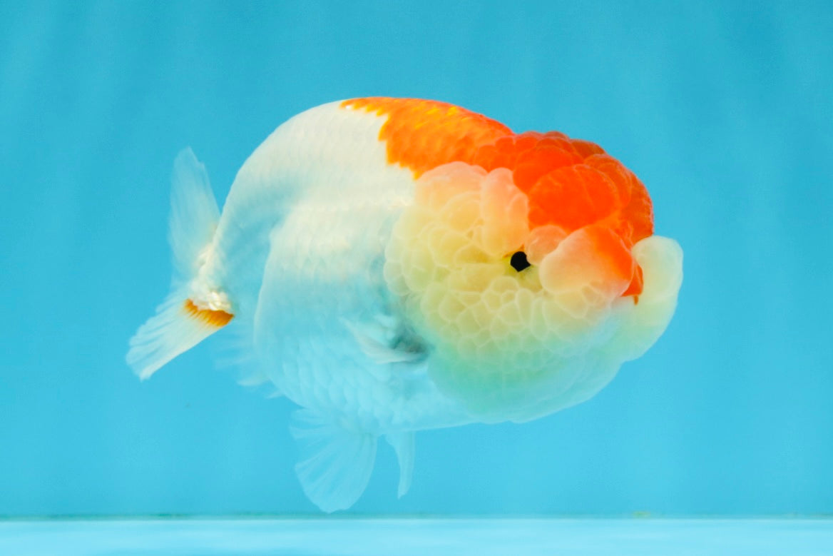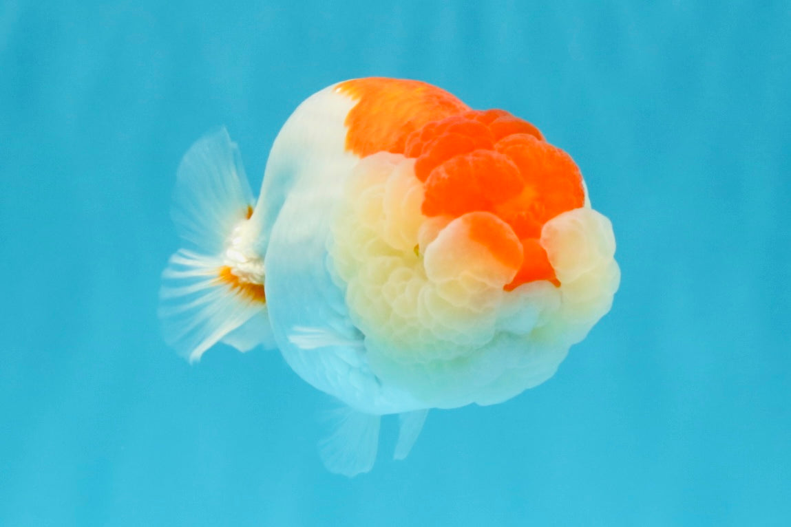 Compact Ranchu-style body with red-white pattern. Smooth back and calm swim. Cute and balanced.