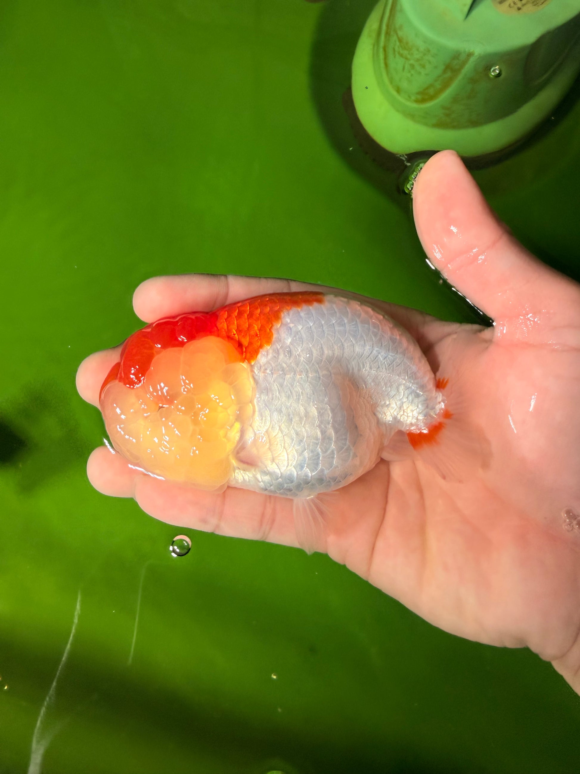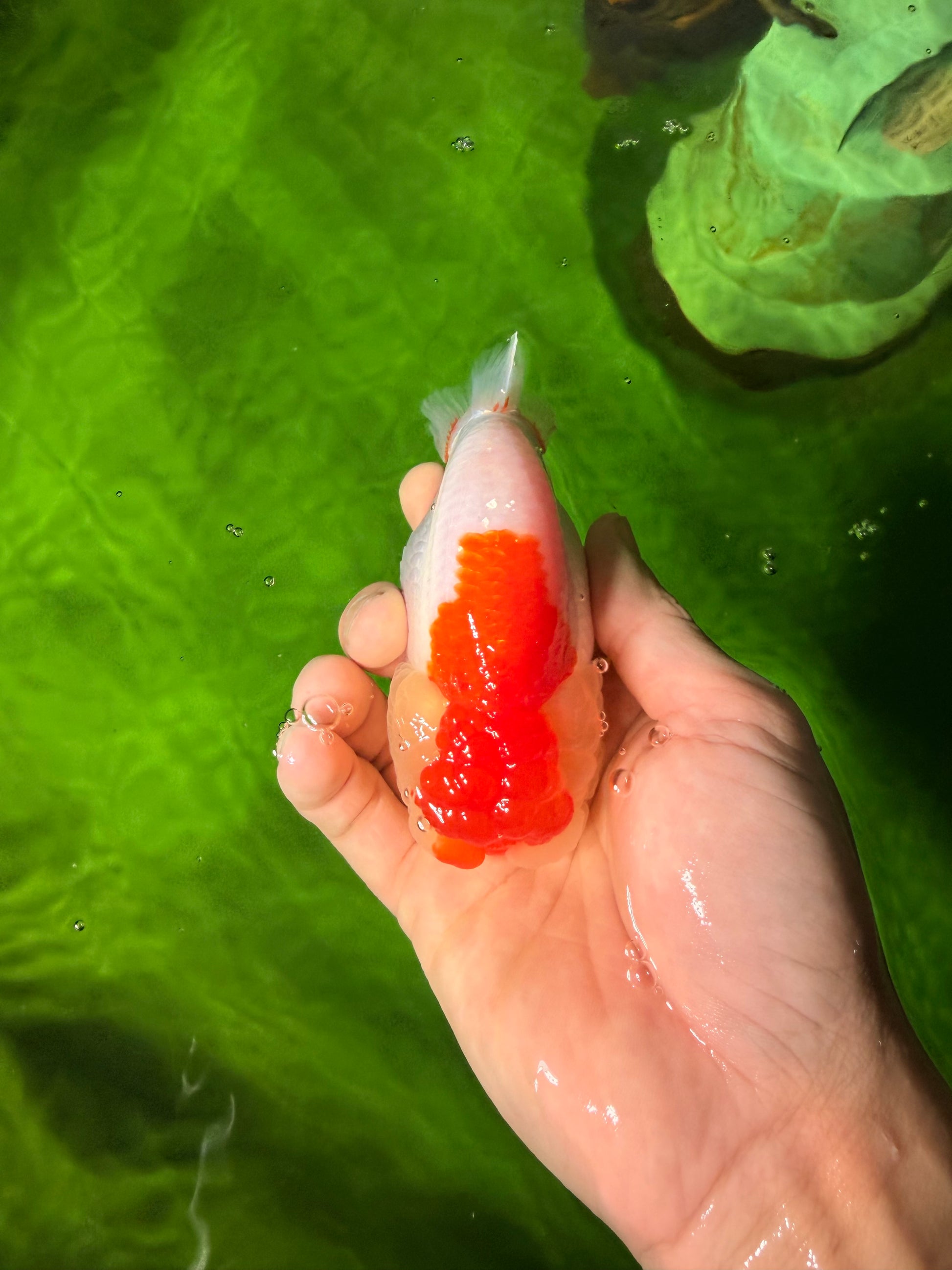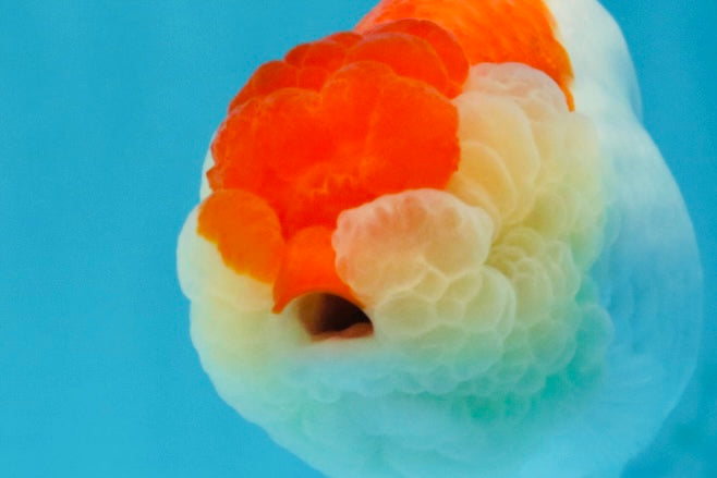 Compact Ranchu-style body with red-white pattern. Smooth back and calm swim. Cute and balanced.