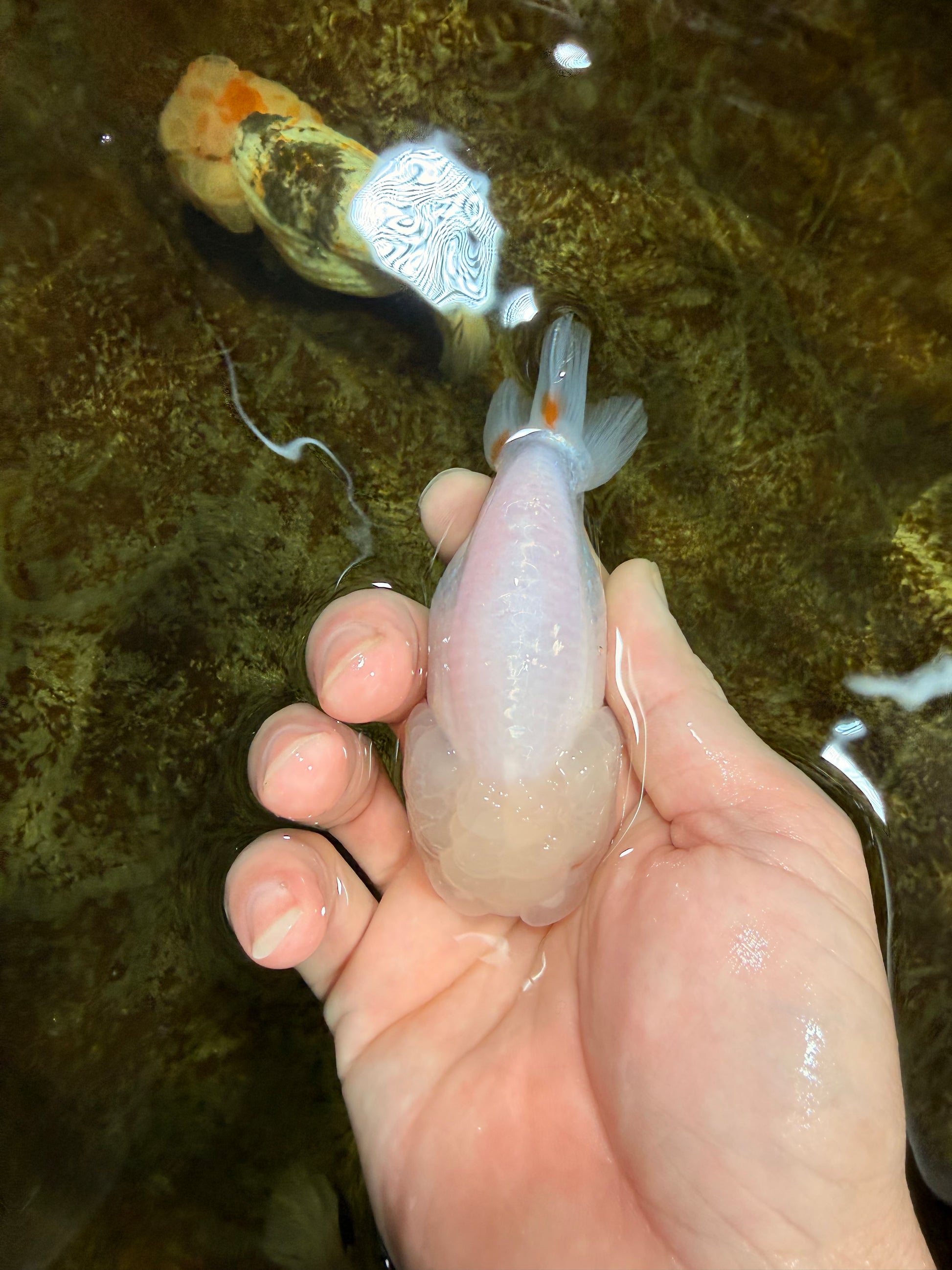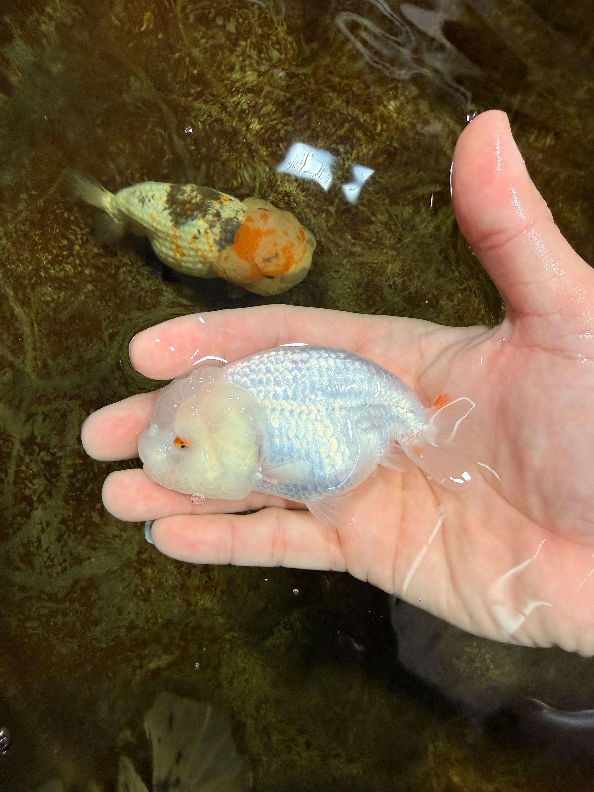 Consistent snow-white tone and compact, rounded shape. Gentle swimmer that blends beautifully in any fancy setup. Clean, calm, and timeless.