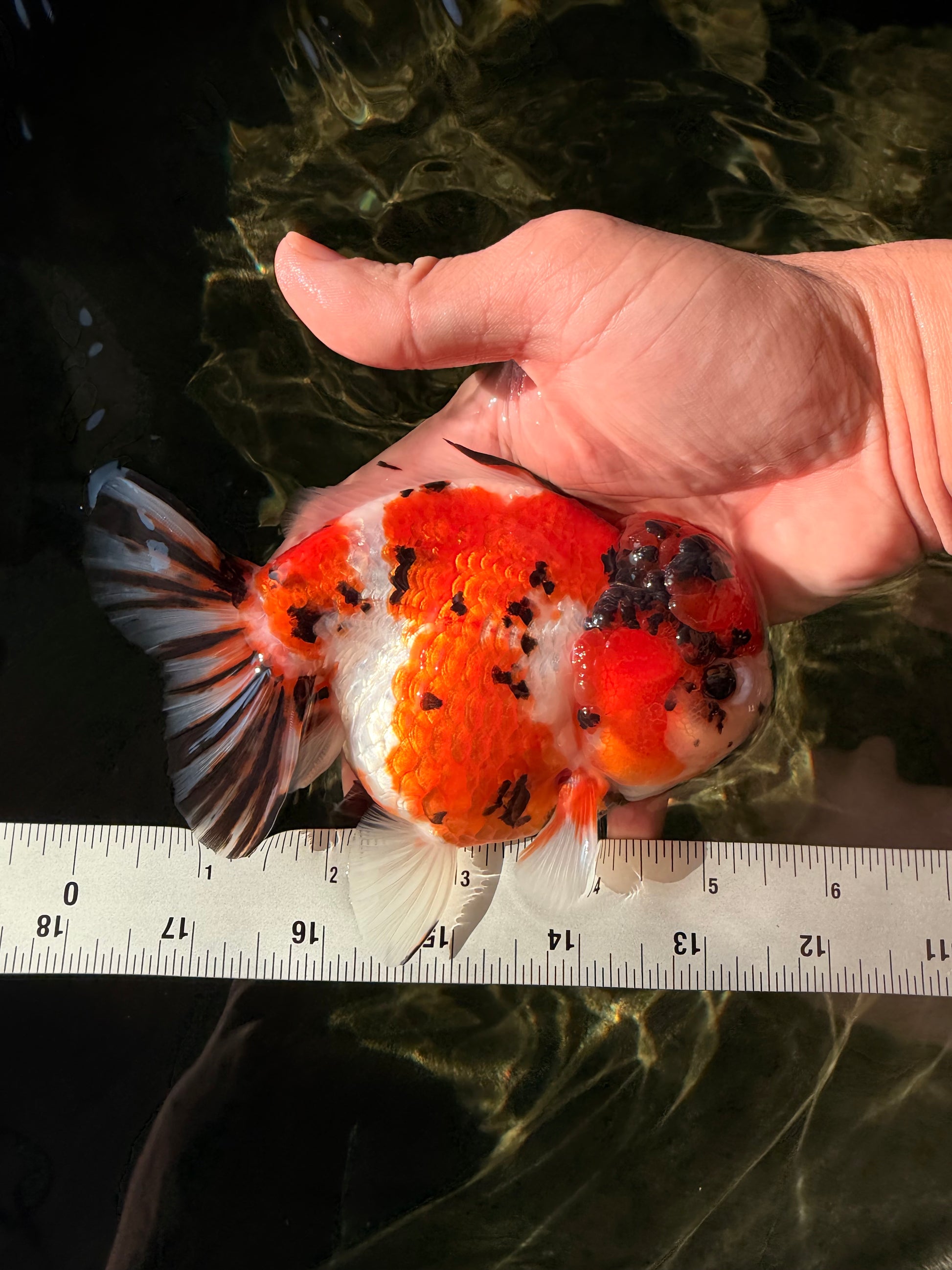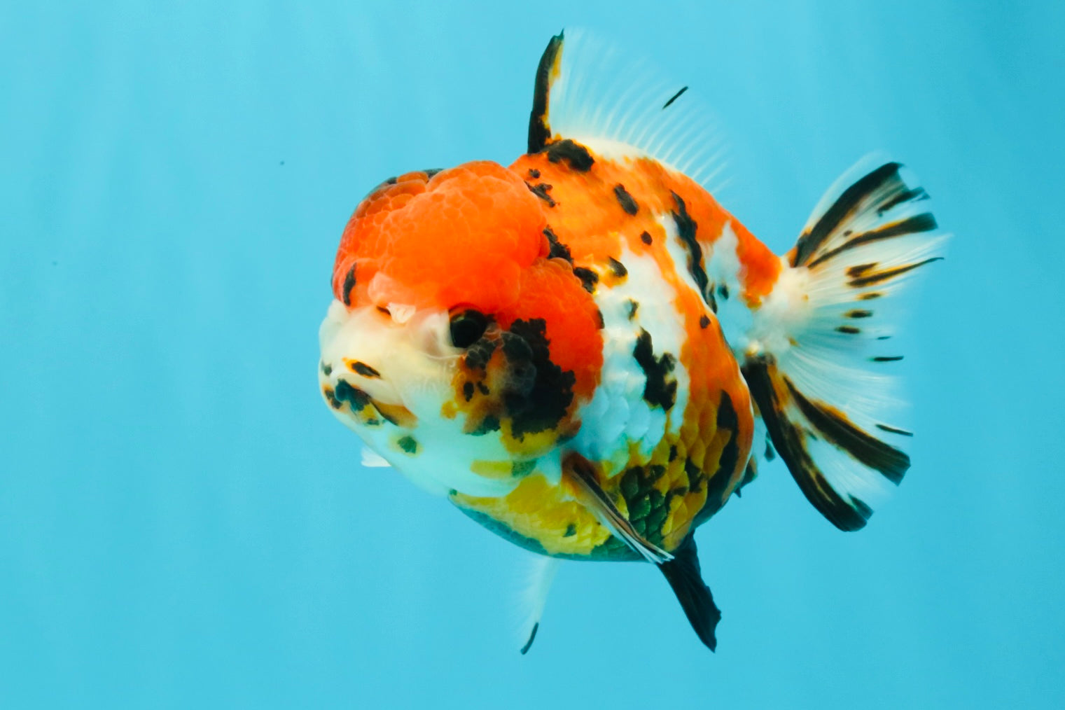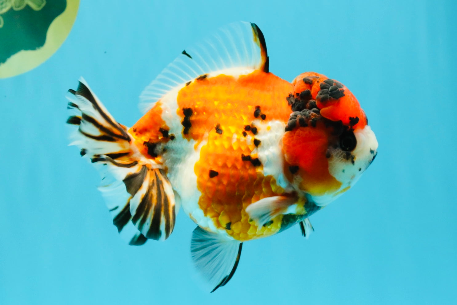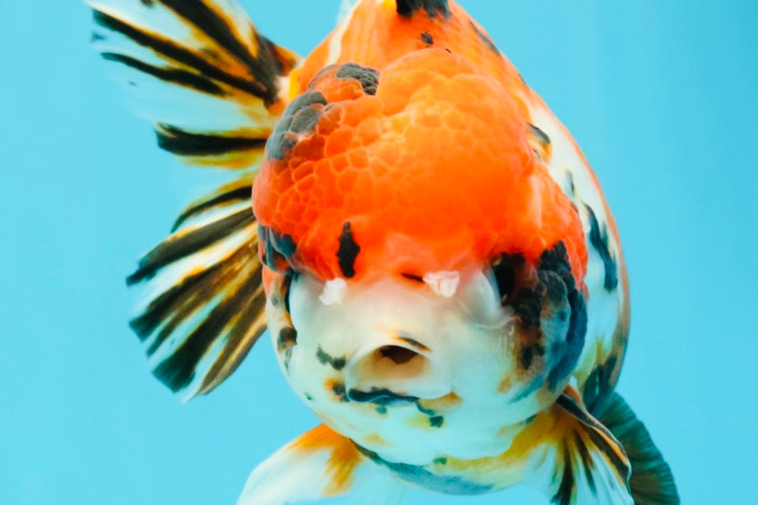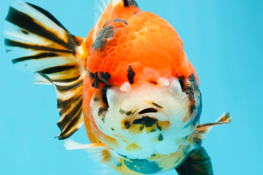 Beautiful mix of tricolor and tiger markings on a rounded Yuanbao body. Balanced fins and playful swim style. A colorful and unique finishing touch for any fancy collection.