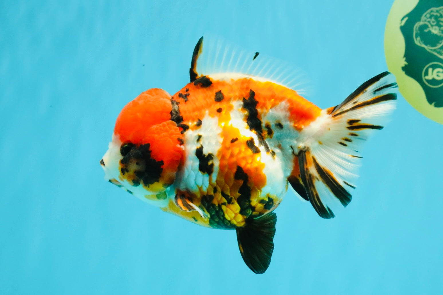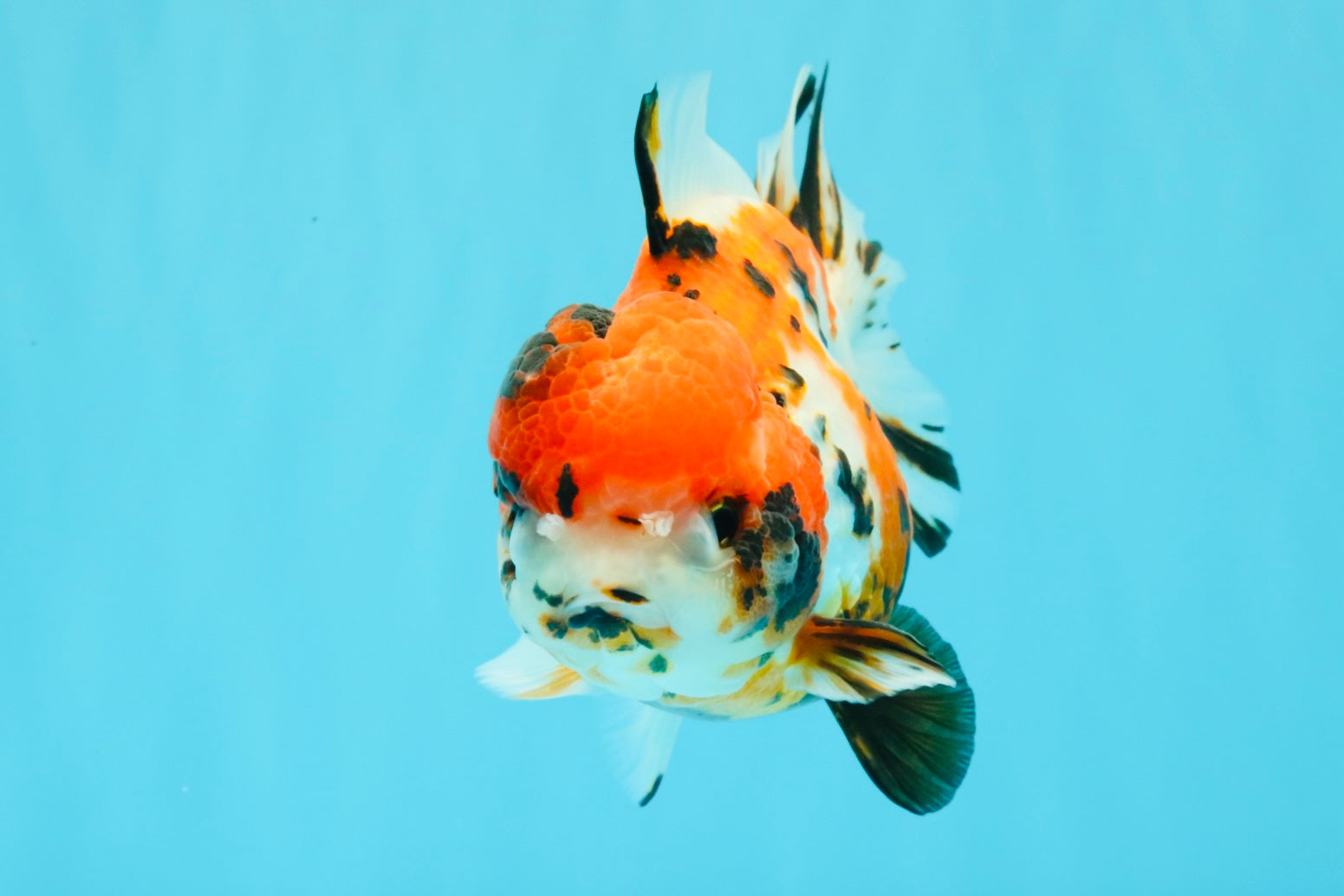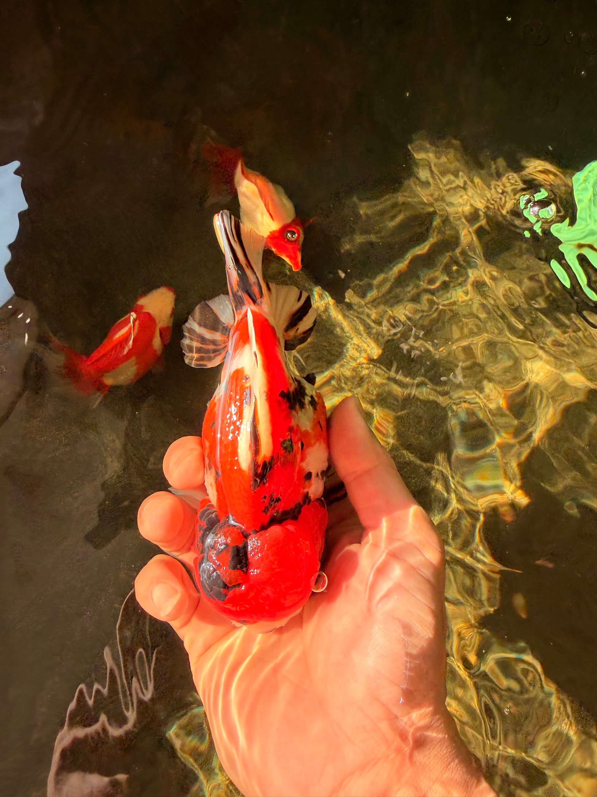 Beautiful mix of tricolor and tiger markings on a rounded Yuanbao body. Balanced fins and playful swim style. A colorful and unique finishing touch for any fancy collection.